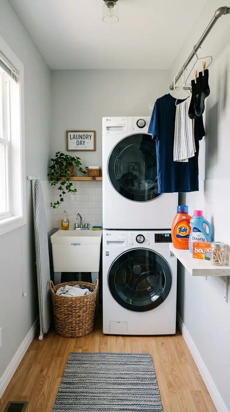 Stacking your washer and dryer is the single most effective way to save floor space. A stackable unit or a stacking kit for side-by-side machines allows you to use vertical space that would otherwise be wasted. Place the stacked units in a corner or inside a closet. Use the space beside the stack for a narrow rolling cart or slim shelves.
