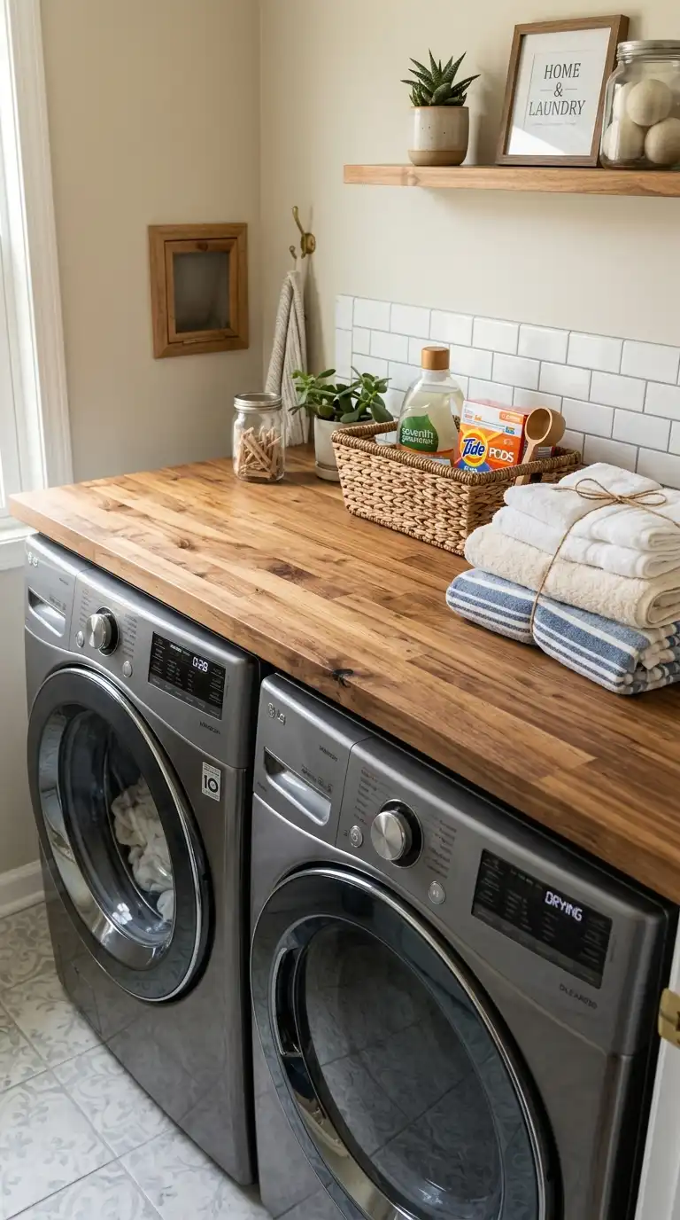 Install a continuous countertop over your front-loading washer and dryer to create a folding station. Use butcher block, laminate, or quartz for a durable surface. The countertop provides valuable workspace without taking up additional floor space. Use the space above for wall cabinets or open shelving.