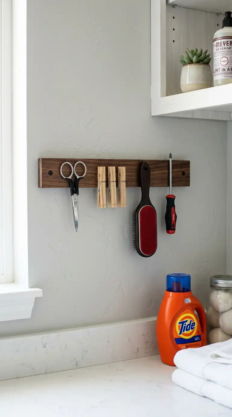 Install a magnetic strip on the wall, on the side of the washer, or inside a cabinet door to hold small metal items. Use it for scissors, clothespins, a lint remover, a small screwdriver, and even a small dustpan and brush. This keeps these items off the counter and easily accessible.