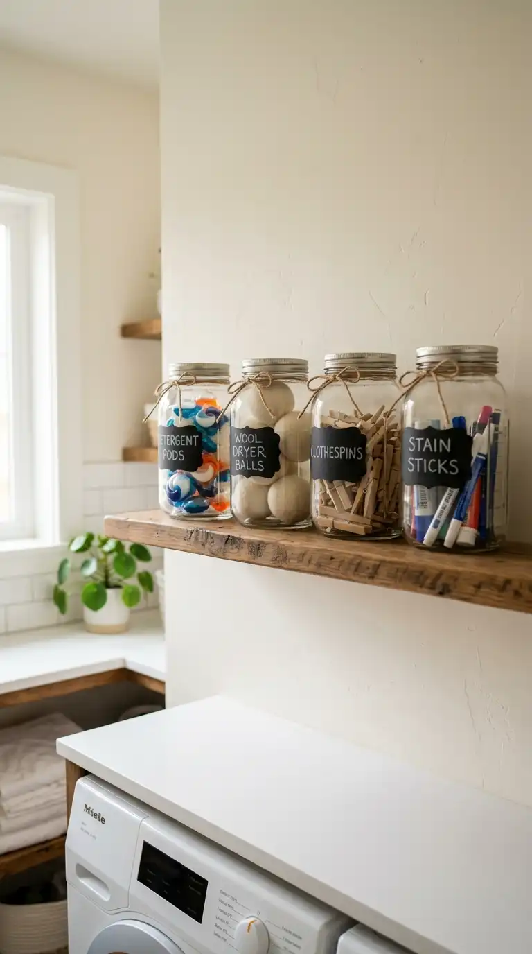 Store small laundry supplies in clear glass jars on open shelves. This keeps items visible and adds a decorative touch. Use jars for detergent pods, wool dryer balls, clothespins, and stain sticks. Label each jar with a chalkboard label or a simple tag. Group jars on a single shelf to keep the counter clear.