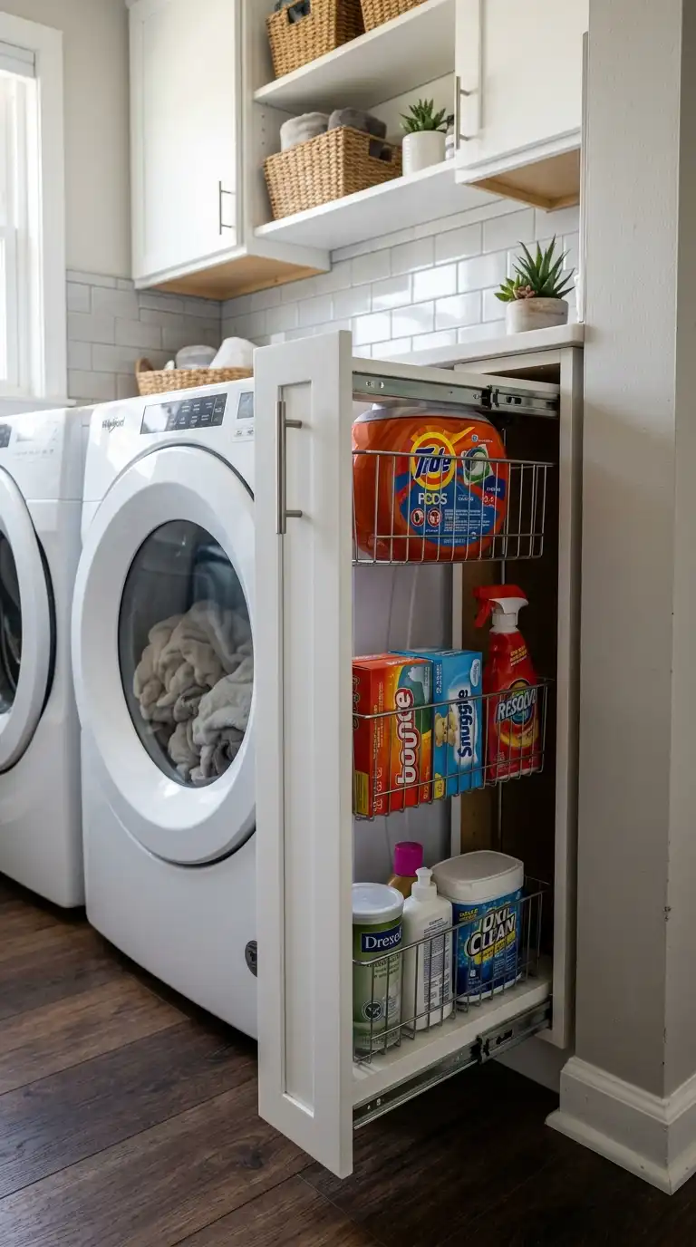 A narrow pull-out cabinet can fit into the smallest gap beside your washer and dryer, between appliances, or in an unused corner. Use it to store detergent, dryer sheets, stain removers, and other supplies. Install pull-out wire baskets or adjustable shelves inside for easy access.