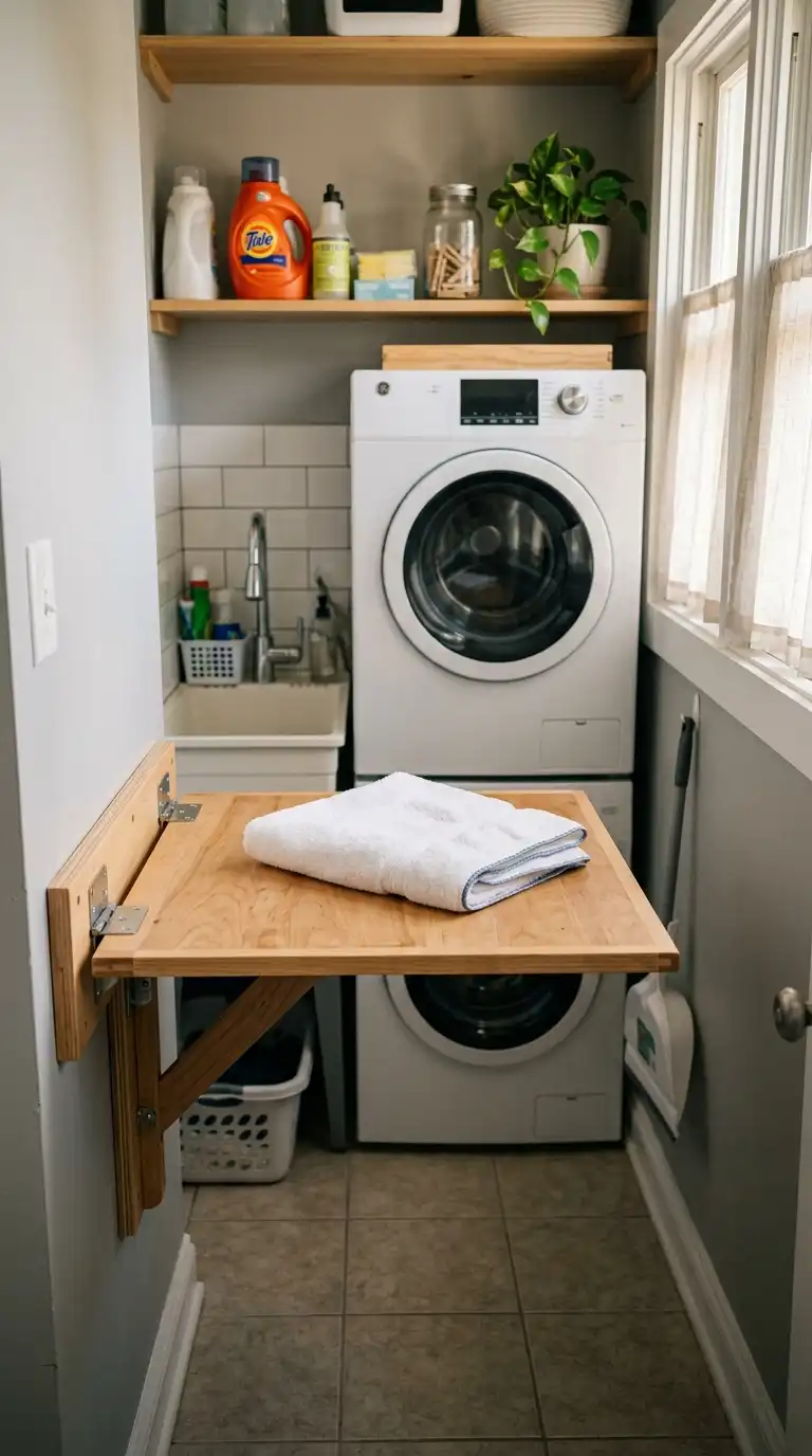 If you don’t have space for a full countertop, install a drop-down folding table that mounts to the wall. When not in use, the table folds flat against the wall. When needed, pull it down to create a sturdy surface for folding clothes. This is an excellent solution for very small spaces.