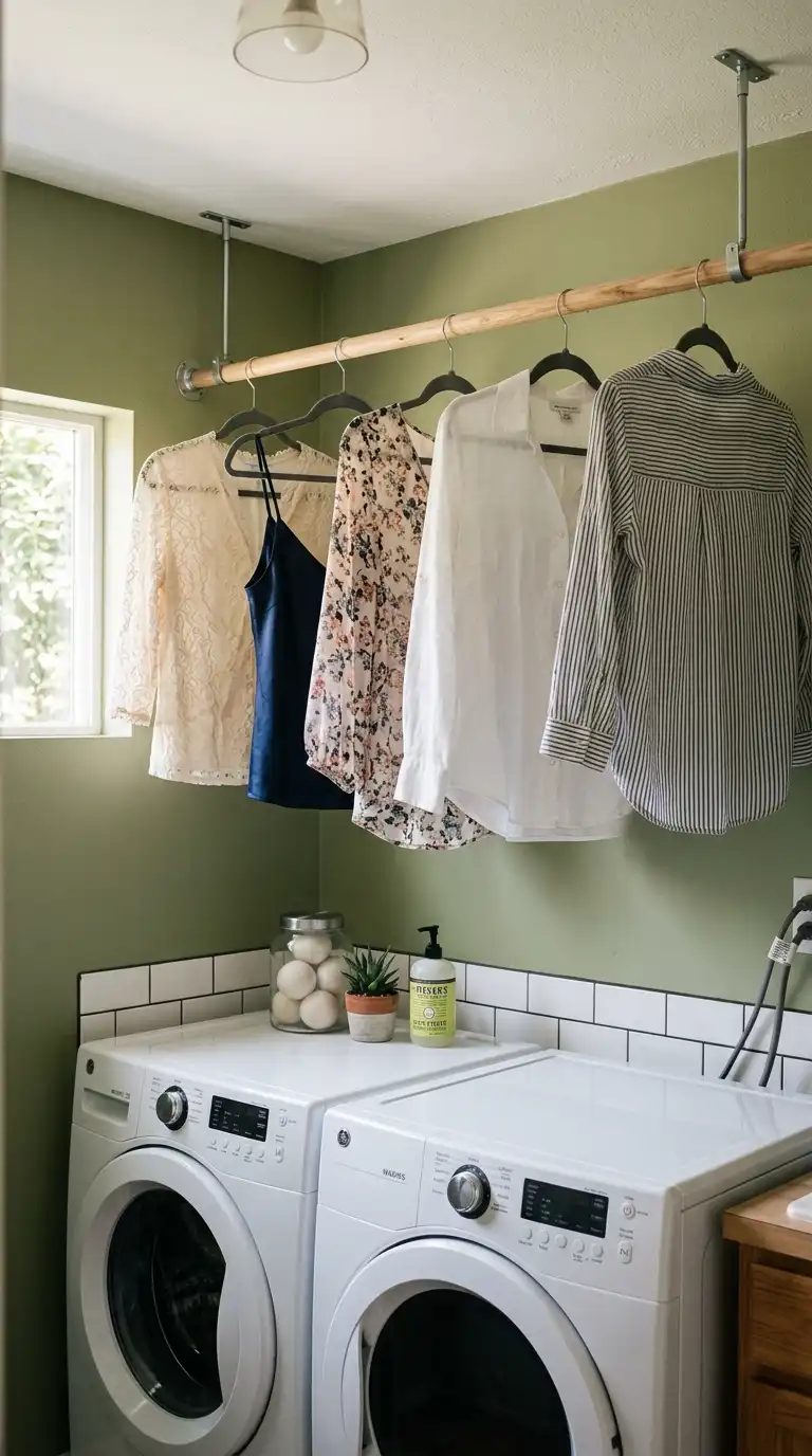 Install a small hanging rod above the washer and dryer or in a narrow space between cabinets. Use it for air-drying delicate items that cannot go in the dryer. The rod can be fixed or retractable. Add a few wooden or velvet hangers for a neat appearance.