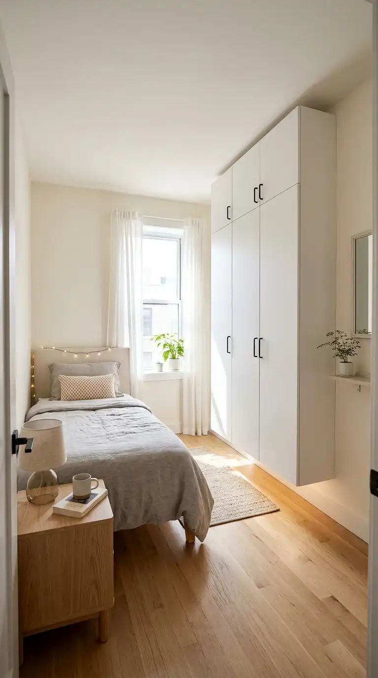 Light colors make small spaces feel larger. Choose white, cream, light gray, or pale wood finishes for your wardrobe to reflect light and create an airy atmosphere. High-gloss finishes add reflectivity, while matte finishes offer a soft, understated look. Keep the color consistent with the walls for a seamless appearance.