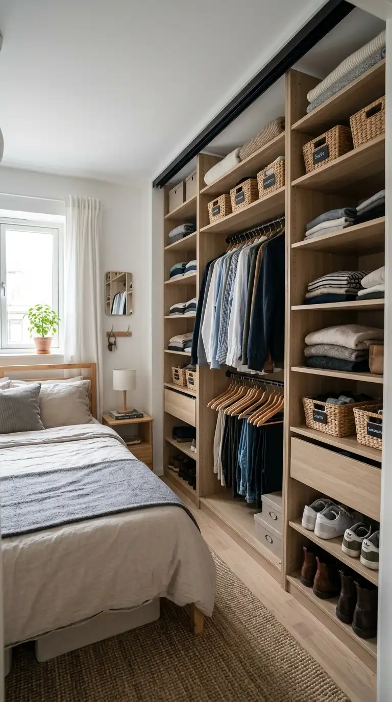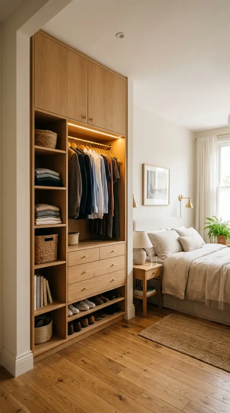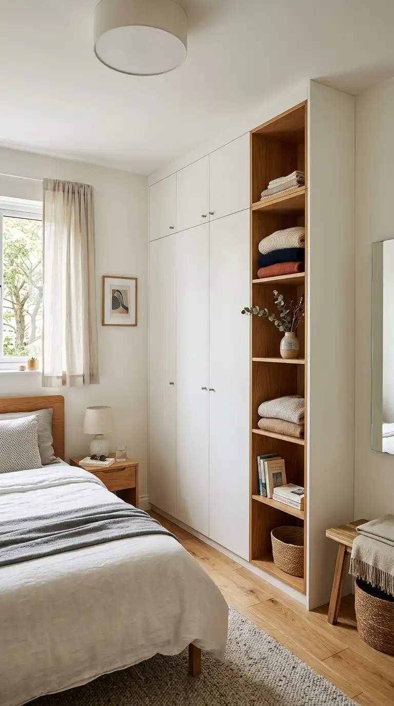 Combine open shelving with closed cabinets to create a wardrobe that feels less bulky. Use open sections to display accessories or folded items, which can make the space feel more open. Closed sections hide everyday clothing. This approach adds visual interest while maintaining functionality.