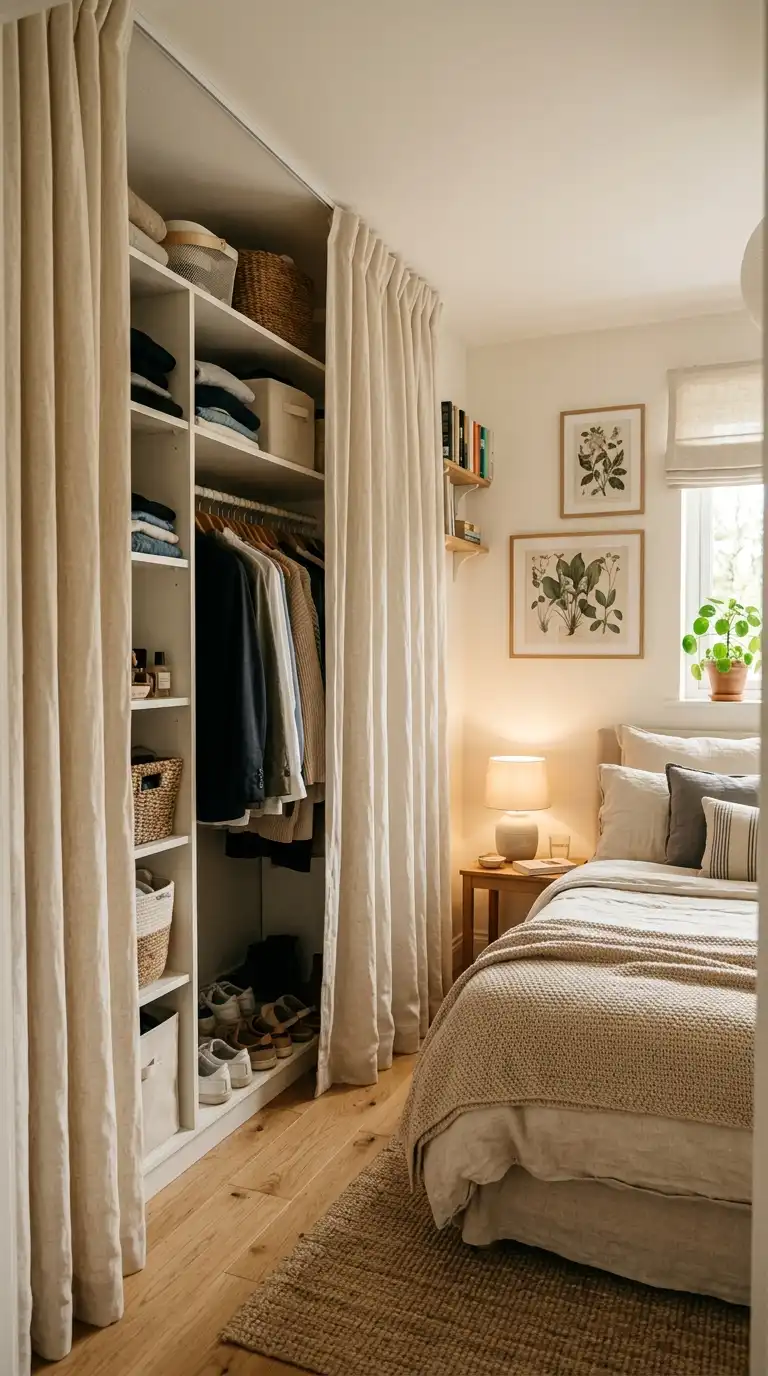For a soft, flexible alternative to traditional doors, use a curtain to conceal your wardrobe. A floor-to-ceiling curtain in linen, cotton, or velvet provides the flexibility to conceal the wardrobe when desired while maintaining a light, textured look. This approach softens the overall appearance and adds a layer of warmth to the room.