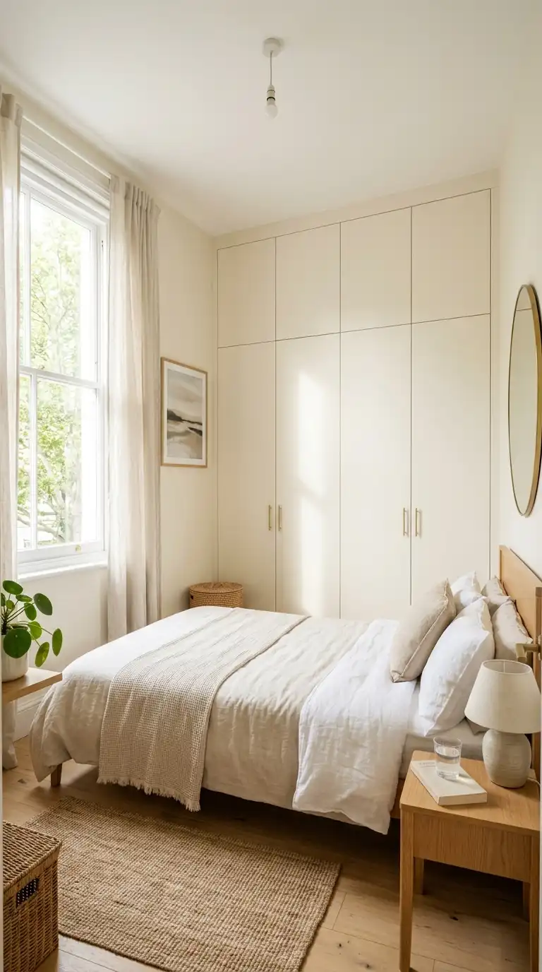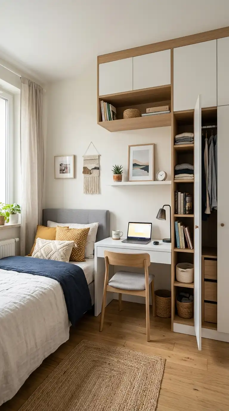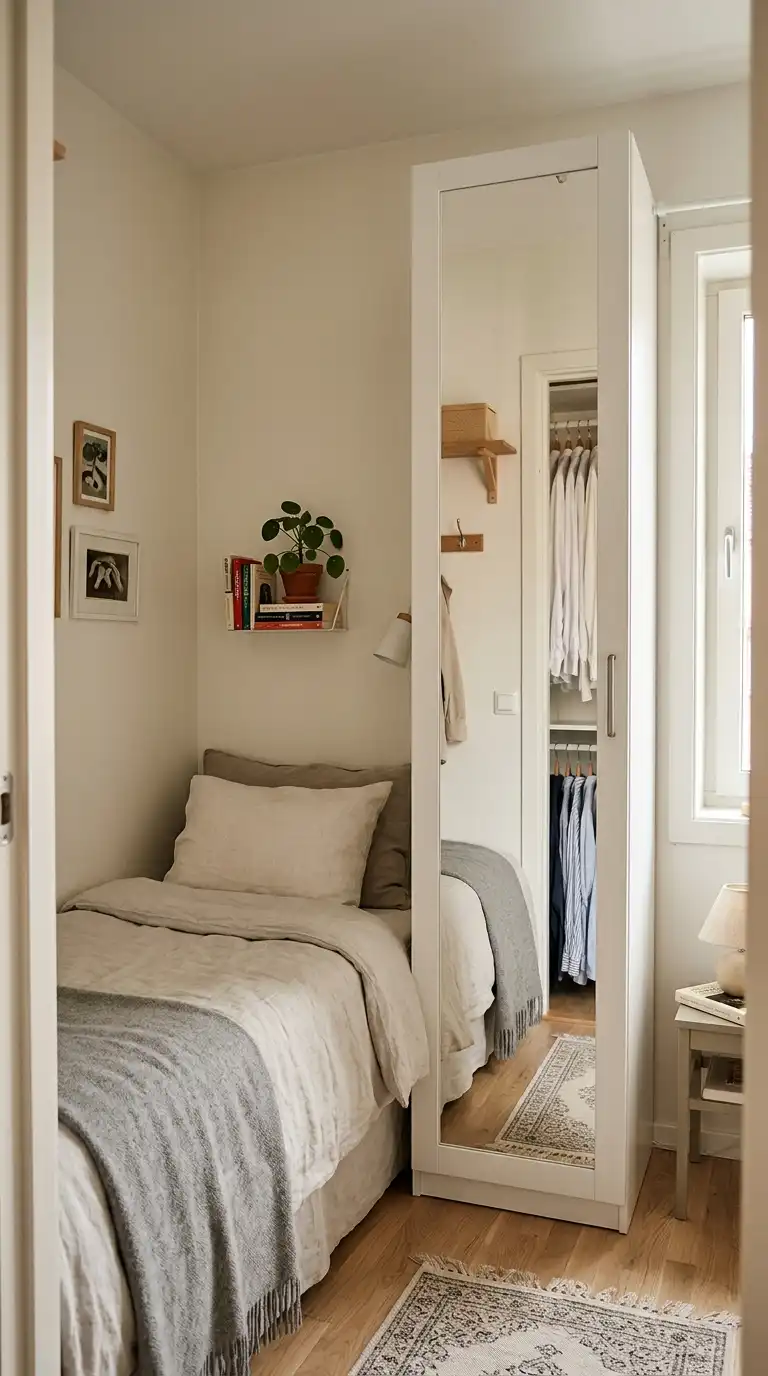 If your small bedroom has an alcove or recessed wall, transform it into a built-in wardrobe. The recessed space provides natural definition, and custom shelving and hanging rods can be fitted precisely to the alcove’s dimensions. This makes use of awkward space while creating a seamless, integrated look.