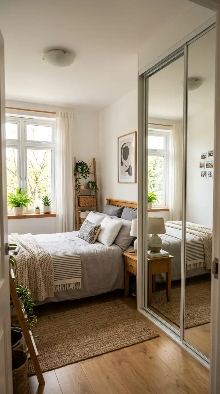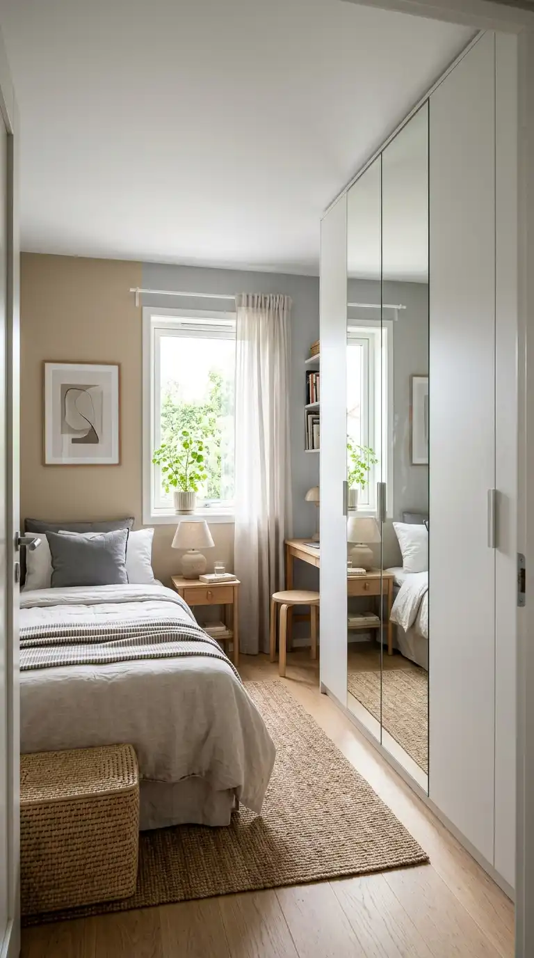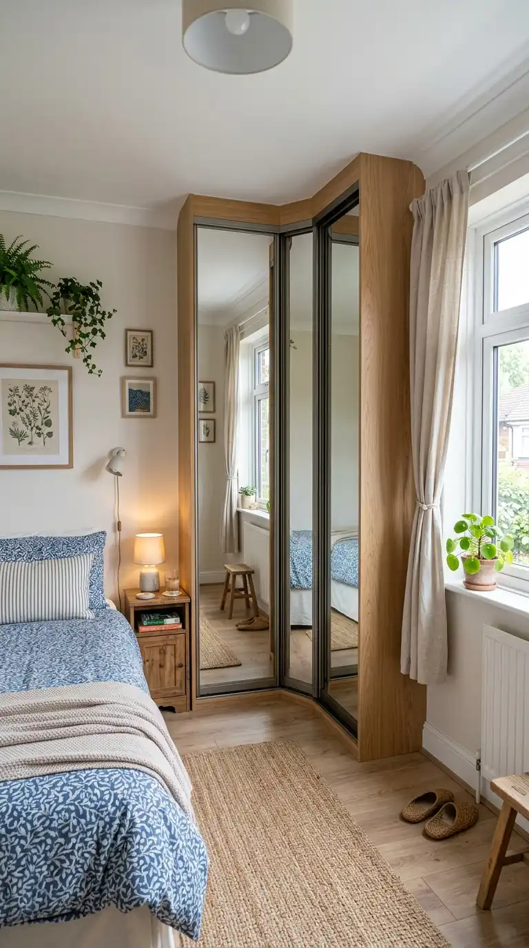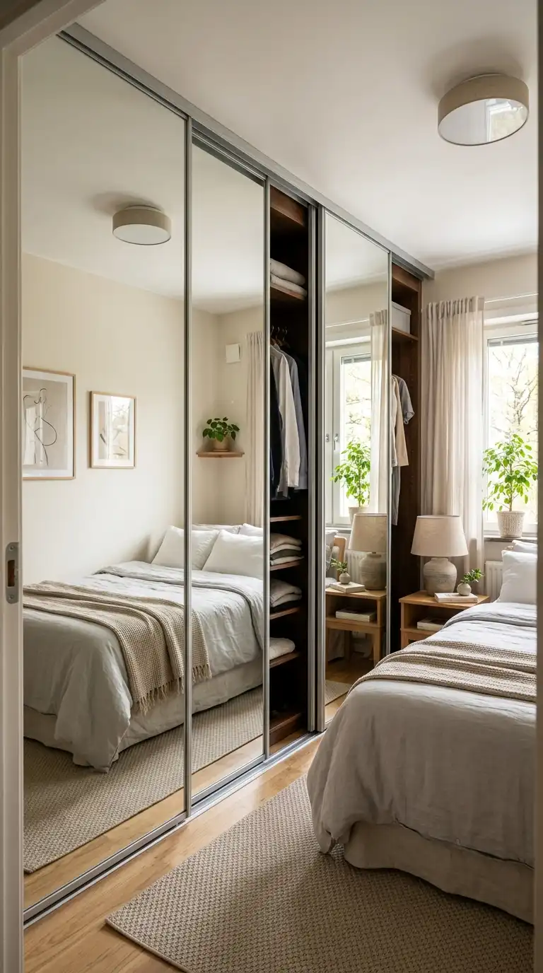 Mirrored doors are a classic choice for small bedrooms. The reflective surface bounces light around the room, making the space feel larger and brighter. Full-height mirrored panels offer the most dramatic effect, while mirrored sections combined with solid panels provide a balanced look. The mirrors also serve as a practical full-length dressing mirror.
