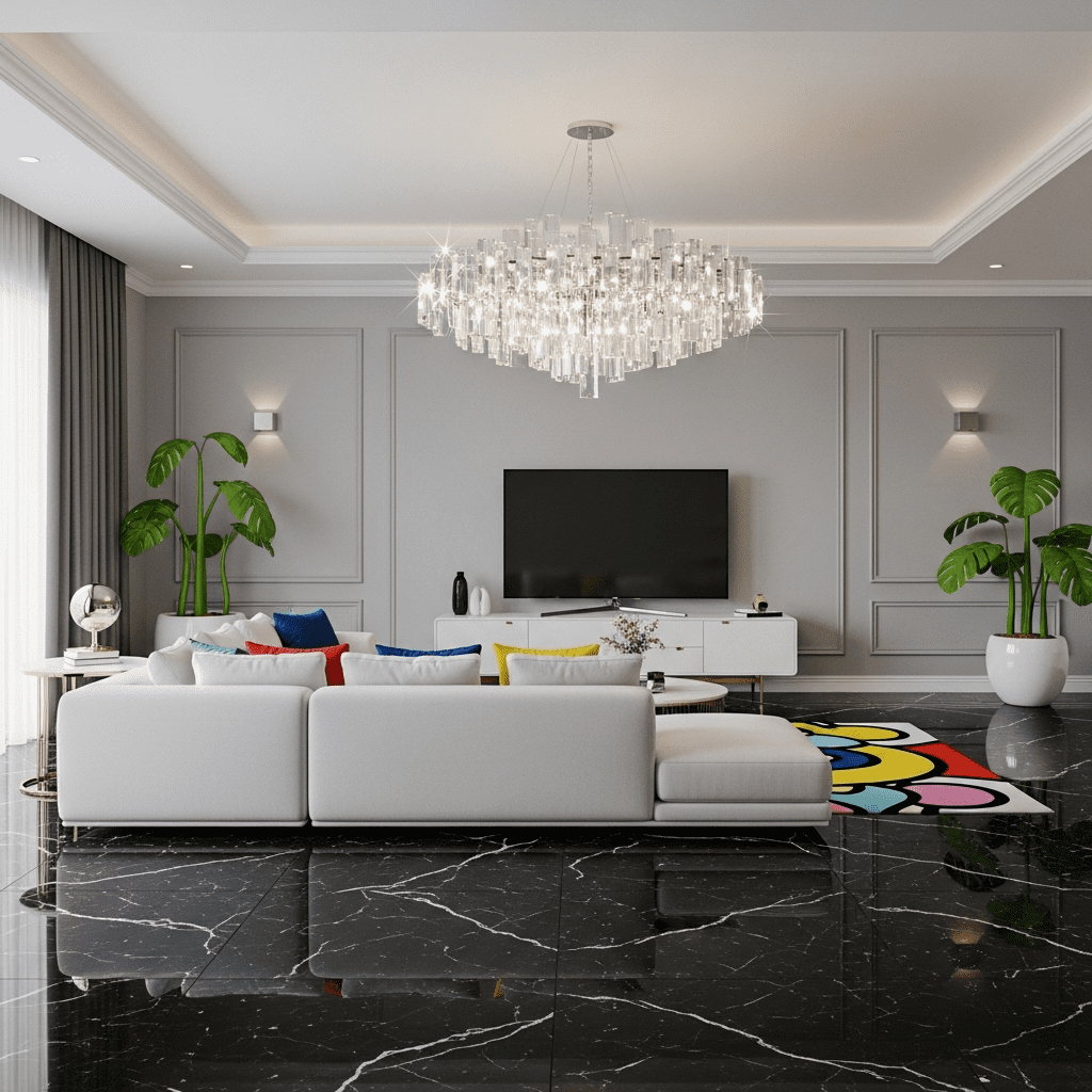 A sophisticated look using the most expensive-looking black marble assets and sleek white couches. It creates a “penthouse” feel for your digital characters.