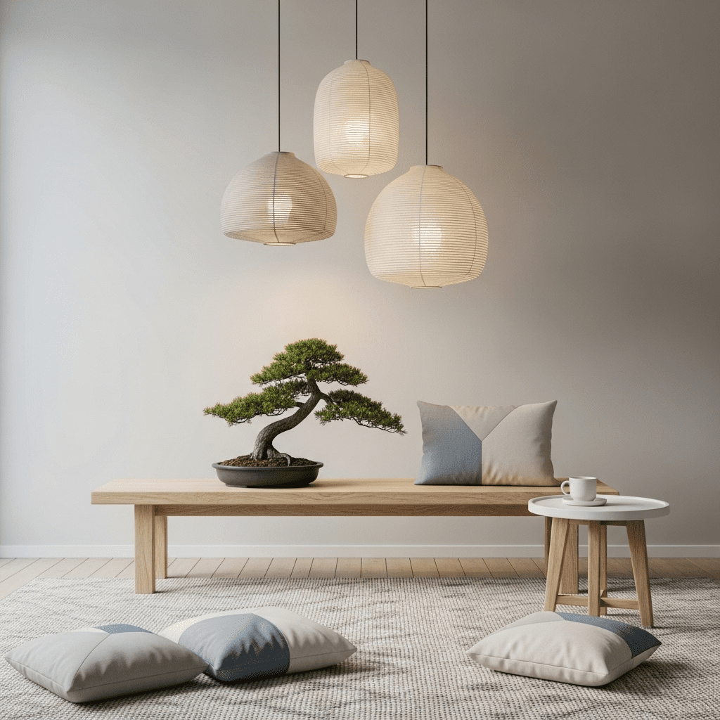 A blend of Japanese and Scandinavian styles, using low-profile beds/sofas and paper lanterns. It prioritizes “empty” space and a few high-quality plants.