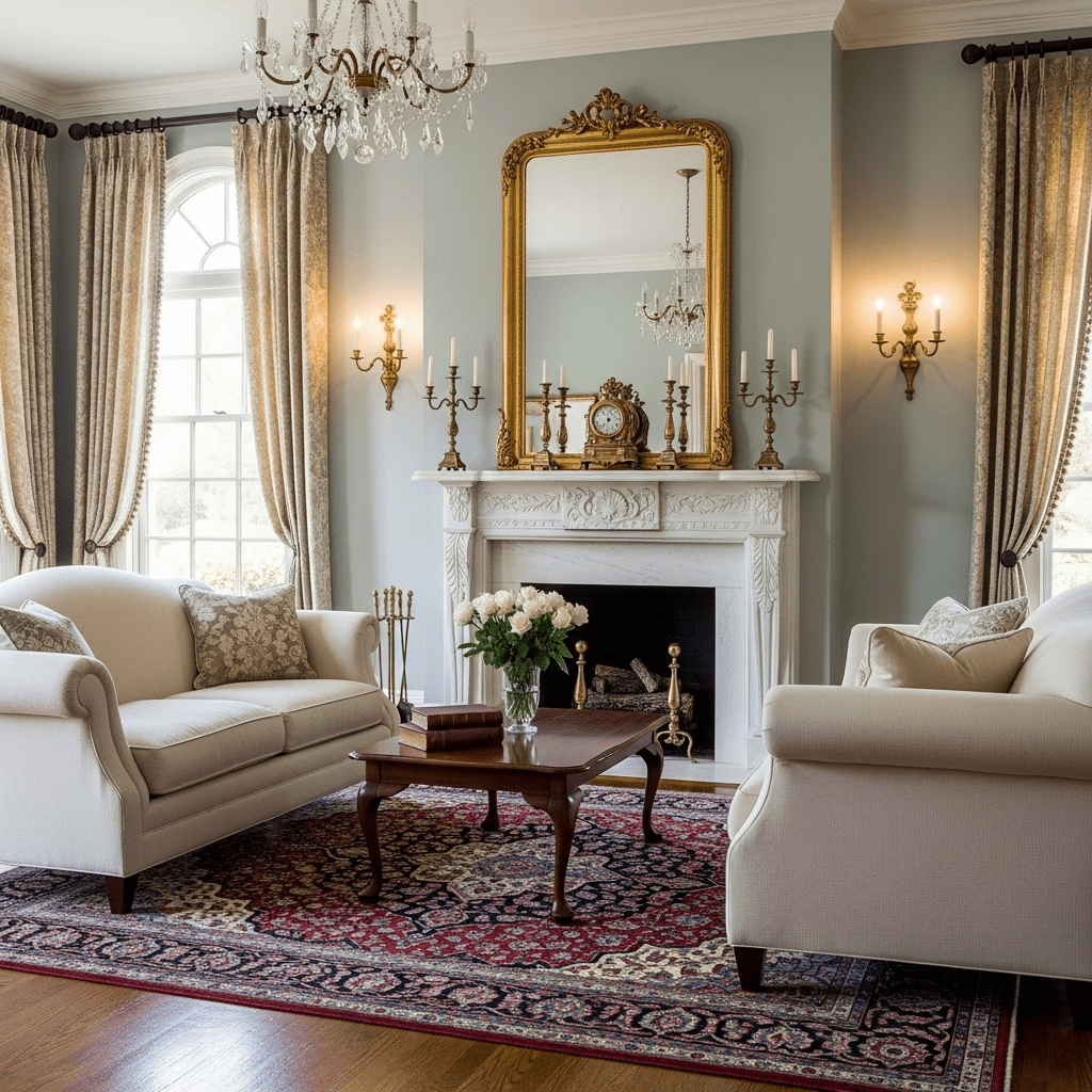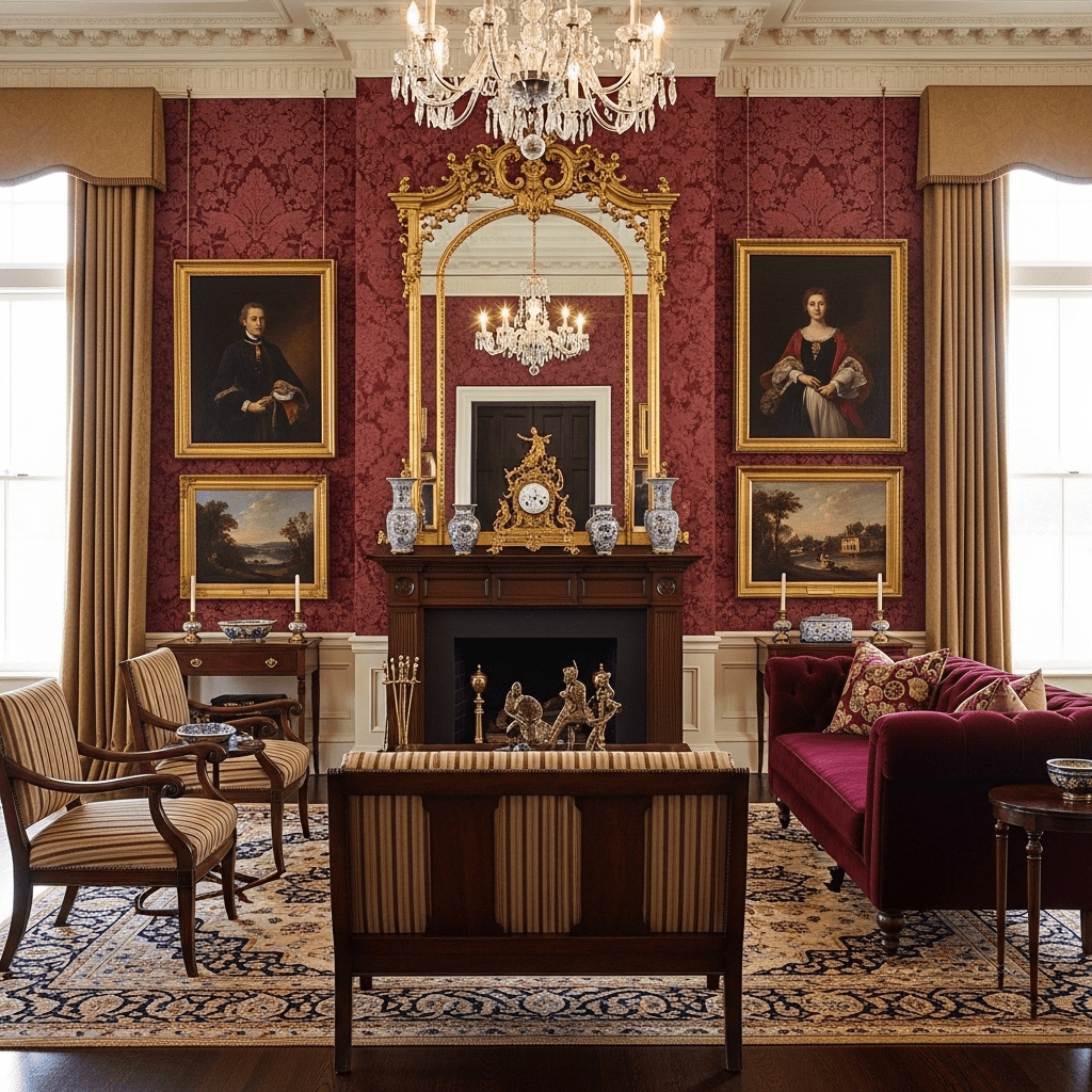 Incorporating ornate gold-leaf frames for mirrors and artwork, paired with brass wall sconces and hardware to add a touch of 19th-century opulence.