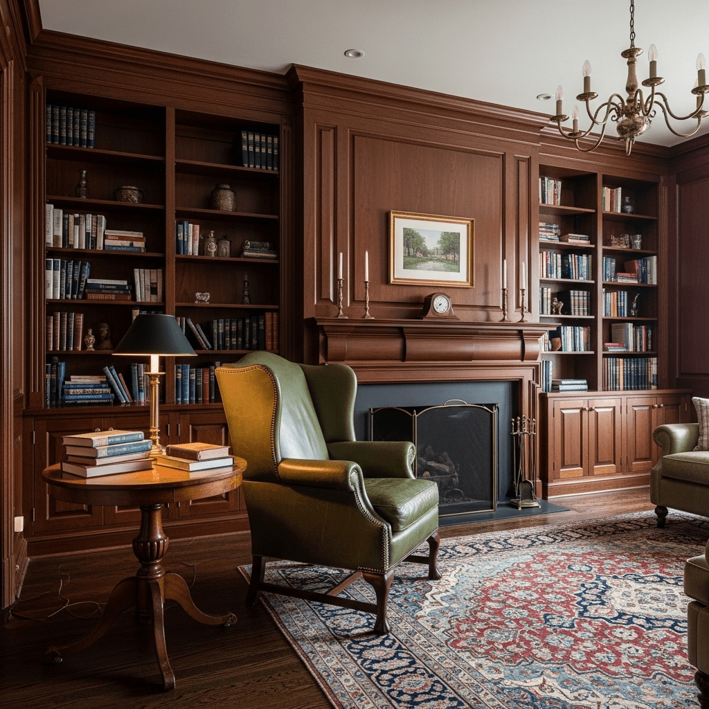 Using dark, rich mahogany or cherry wood for wall-to-wall built-in bookshelves and wall paneling. This creates a scholarly, sophisticated atmosphere.