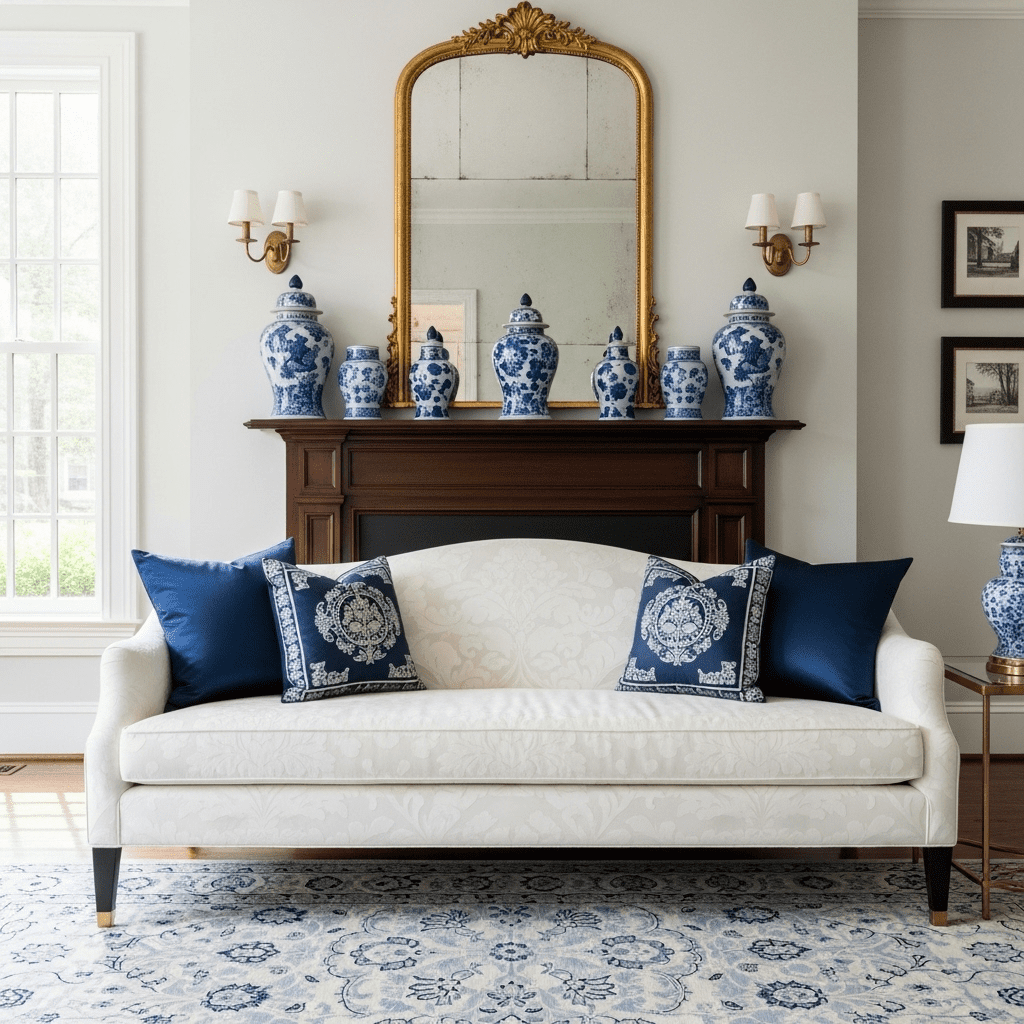 A timeless color palette featuring white upholstery accented by blue and white porcelain vases (ginger jars), silk cushions, and delicate floral patterns.