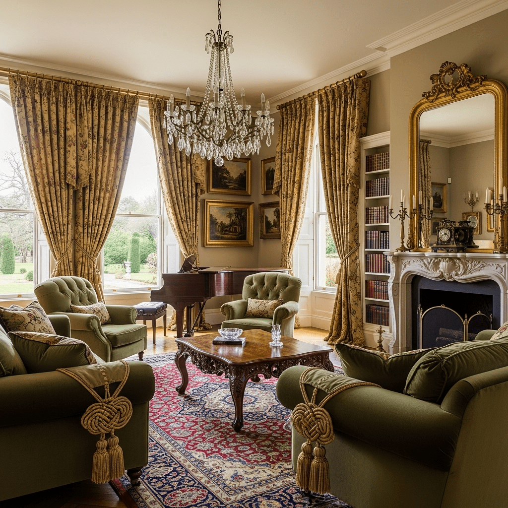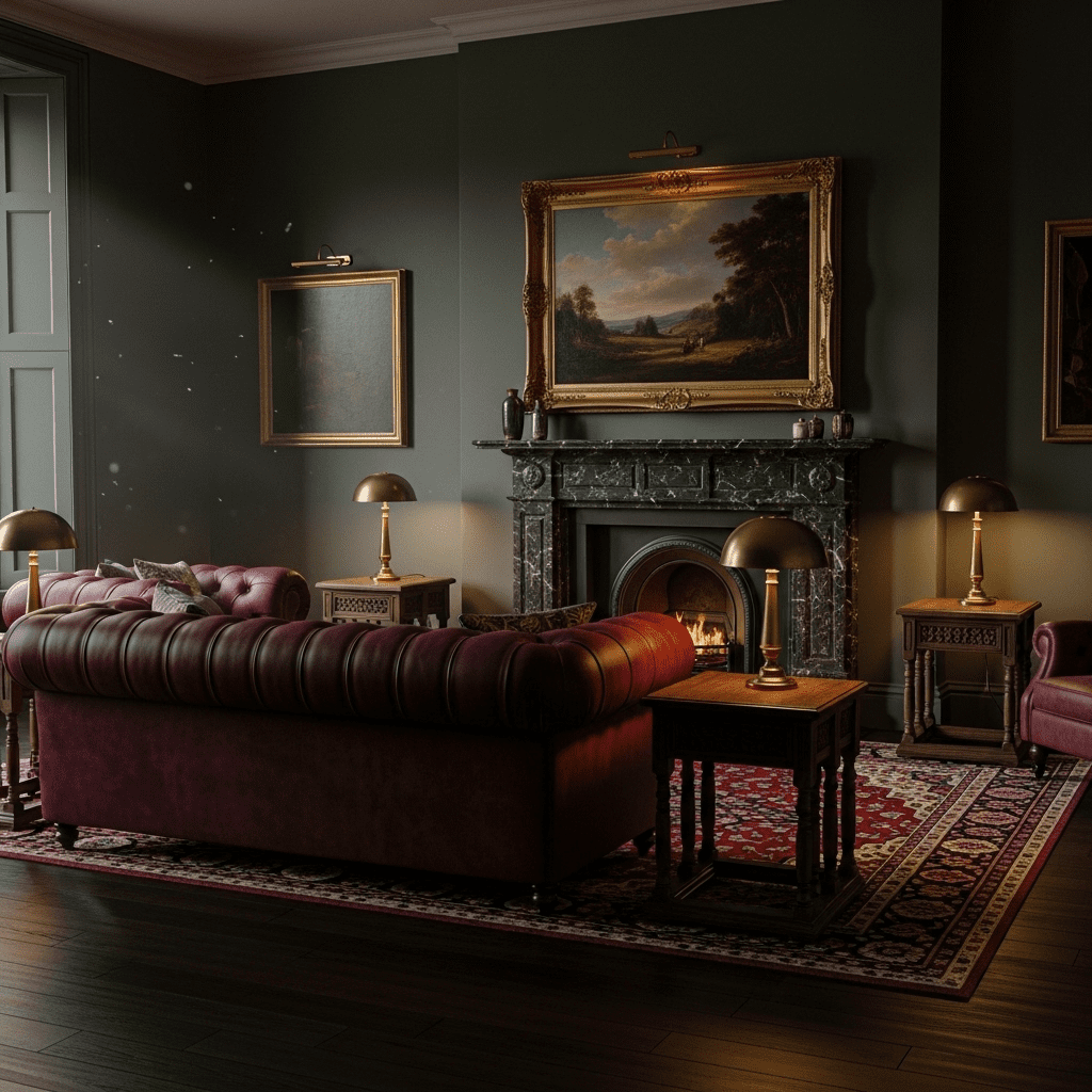 Centering the room around a tufted leather or velvet Chesterfield sofa. Its deep-buttoned back and rolled arms are the hallmarks of British traditionalism.