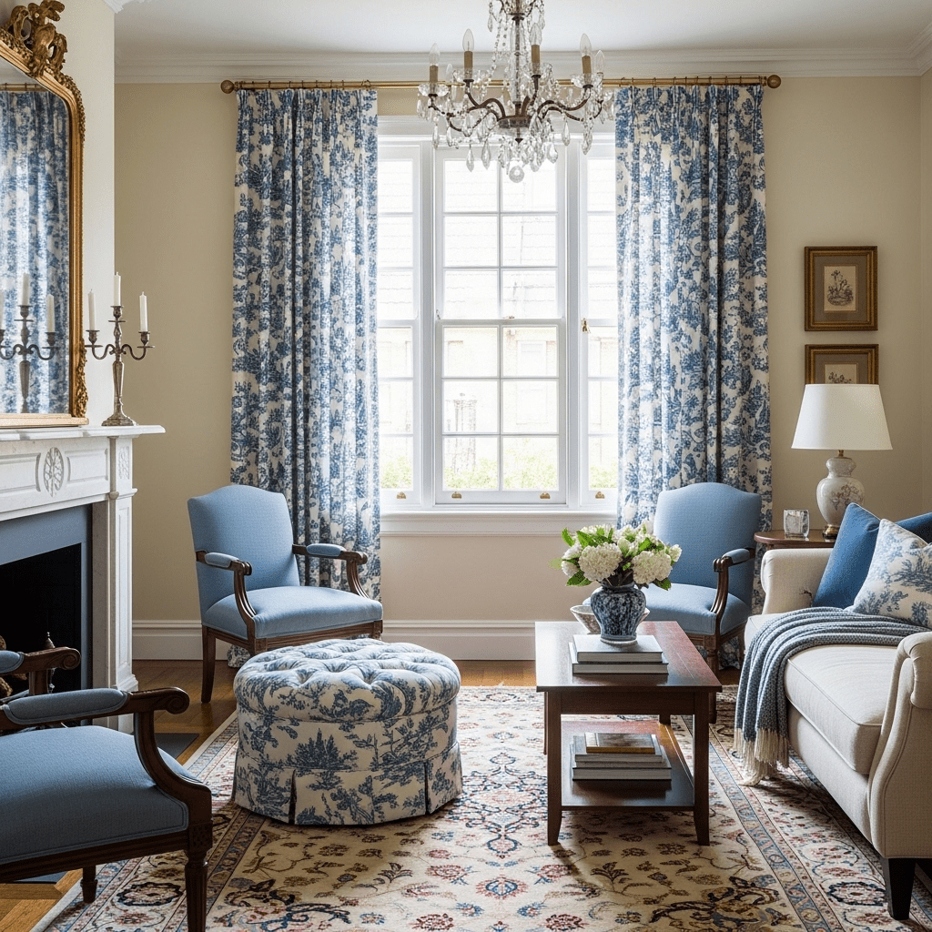 Using the classic French “Toile” fabric (depicting pastoral scenes) for window treatments or a statement armchair to add a narrative, vintage feel.