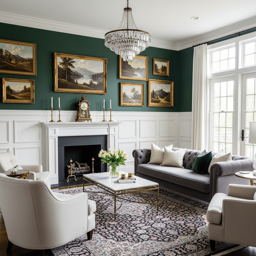 Utilizing decorative wood paneling (wainscoting) on the lower half of the walls, often painted in a crisp white to contrast with rich, dark paint or wallpaper above.