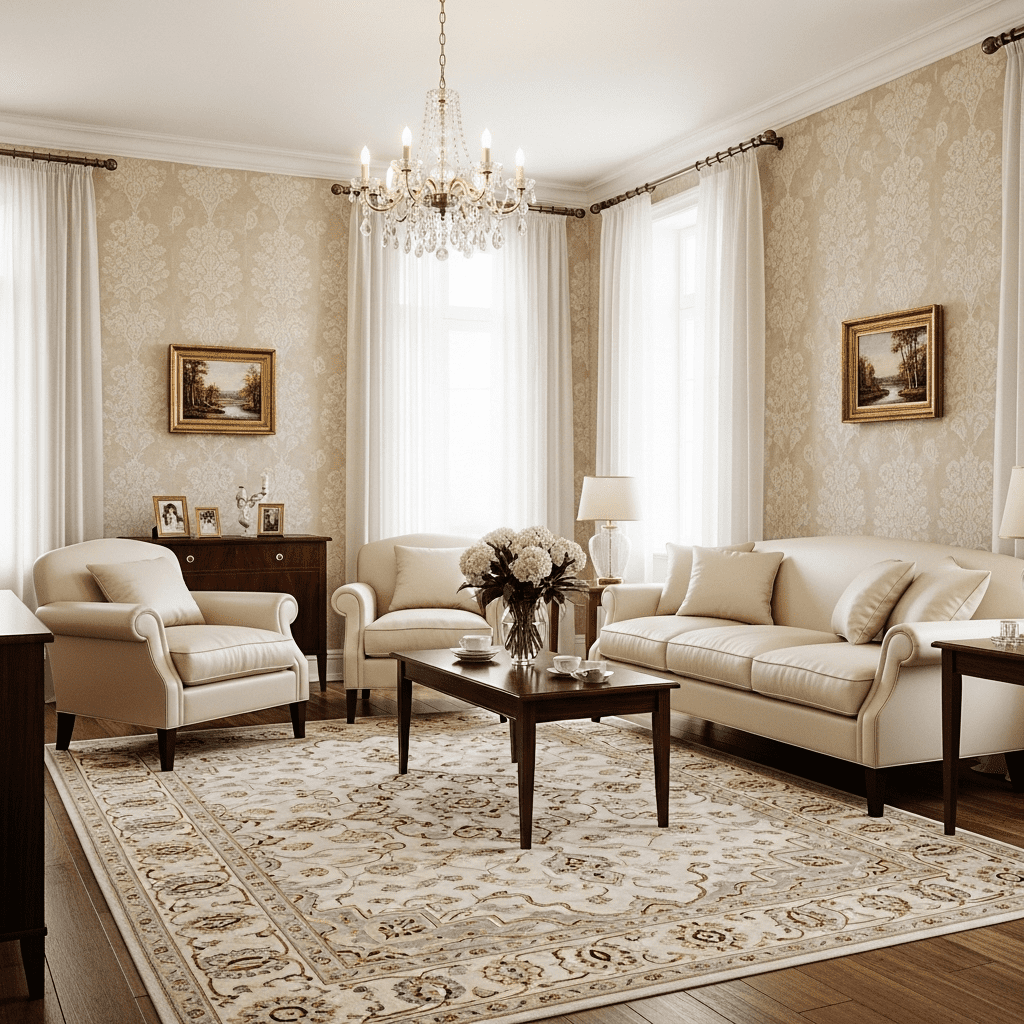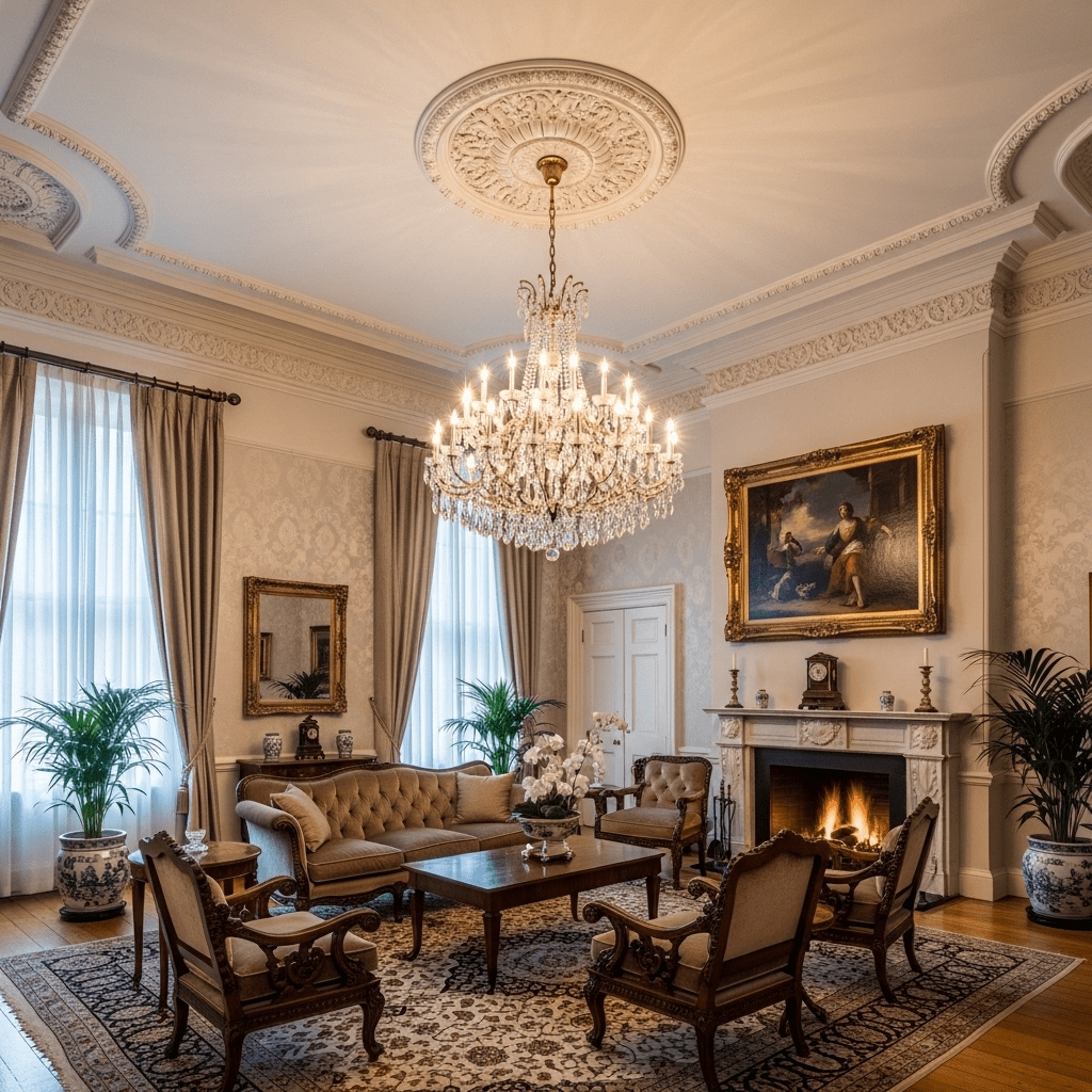 Focusing on the architectural “bones” by highlighting intricate ceiling medallions and thick crown molding, often finished in a soft eggshell white.