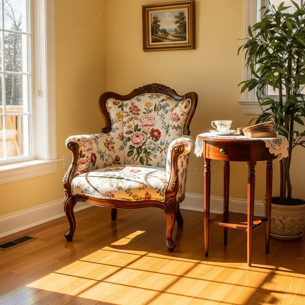 Featuring furniture with graceful “cabriole” (curved) legs, such as a Queen Anne style wing chair or a delicate tea table, placed in a sunlit corner.