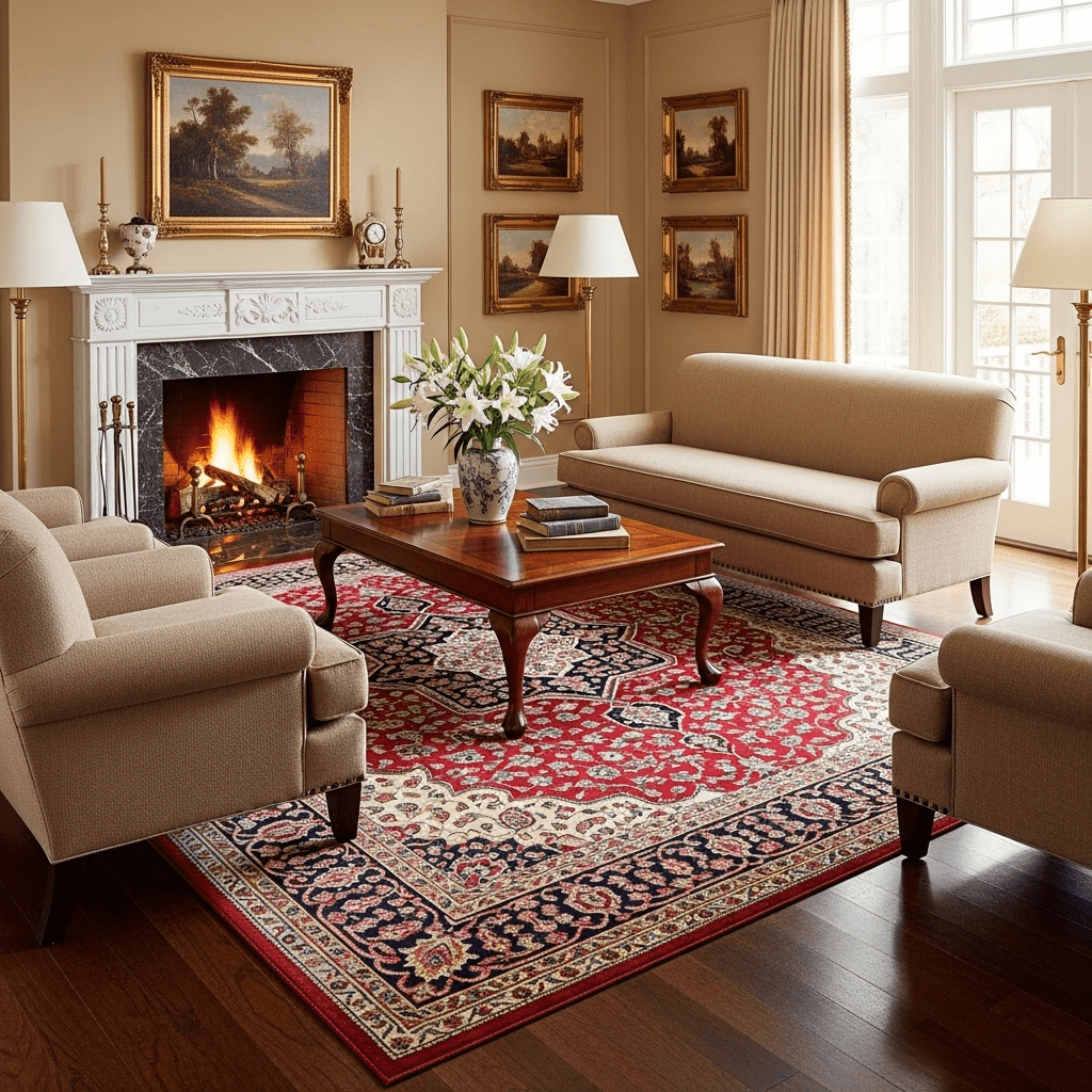 Using a high-knot-count Oriental or Persian rug in deep reds and navys to ground the furniture and provide a complex pattern for the room.