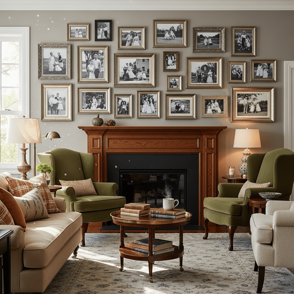 Arranging a dense collection of family portraits and vintage sketches in mismatched but coordinating frames to create a “lived-in” sense of lineage.