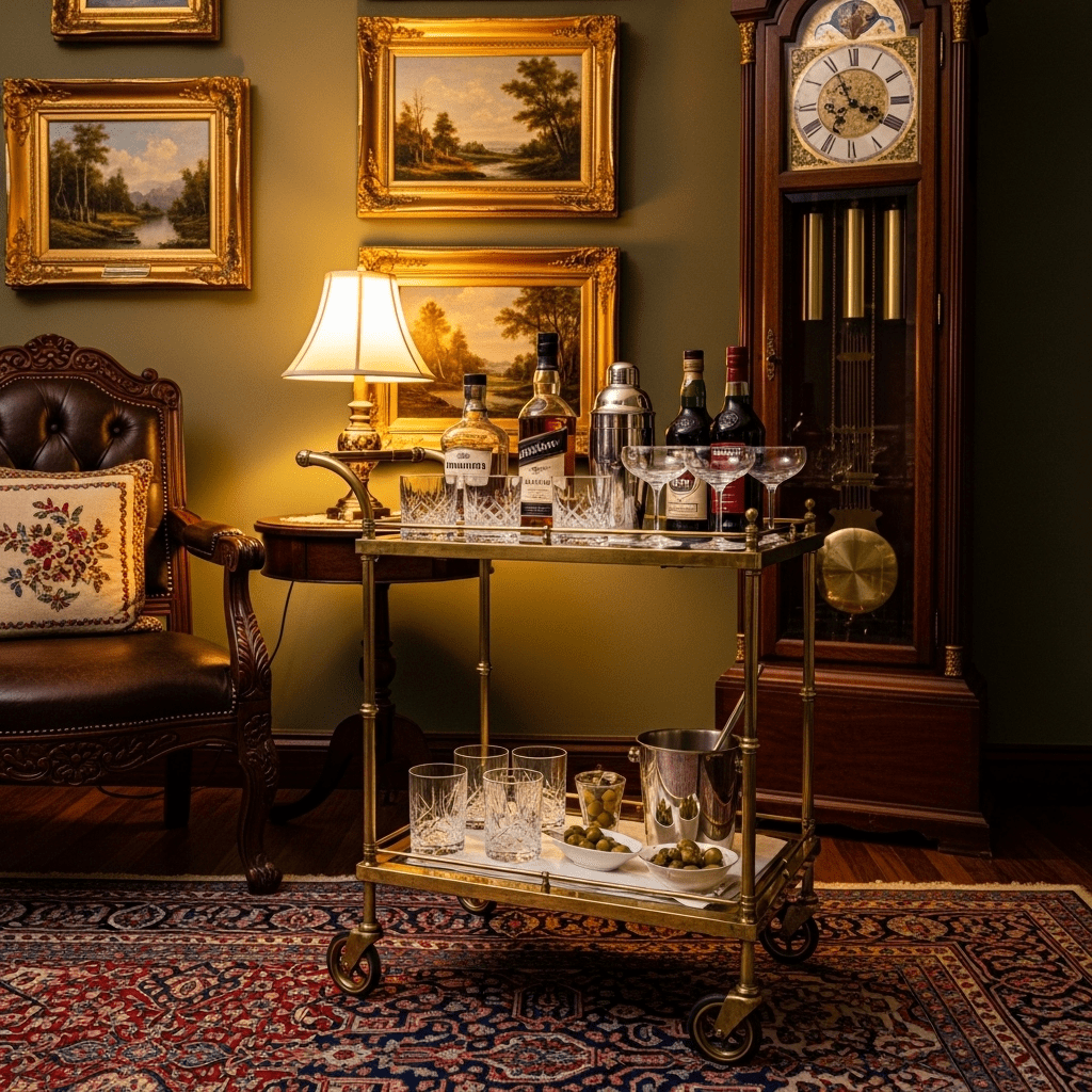 Integrating a vintage brass bar cart stocked with crystal decanters, serving as both a functional entertaining piece and a glamorous decor element.