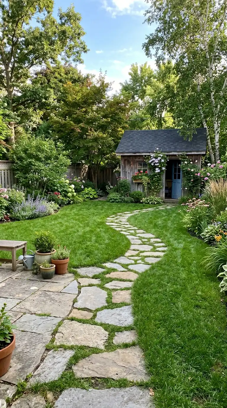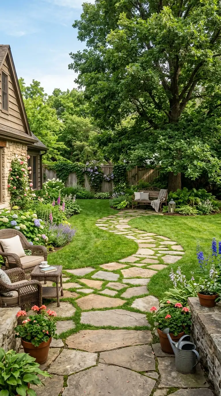 Create a natural-looking pathway by setting irregular stone or concrete pavers into the turf at intervals. The pavers act as stepping stones, guiding guests through the garden without damaging the grass. Use a winding layout for a organic, informal feel. This design is perfect for connecting different zones of your yard—patio to garden, fire pit to seating area.