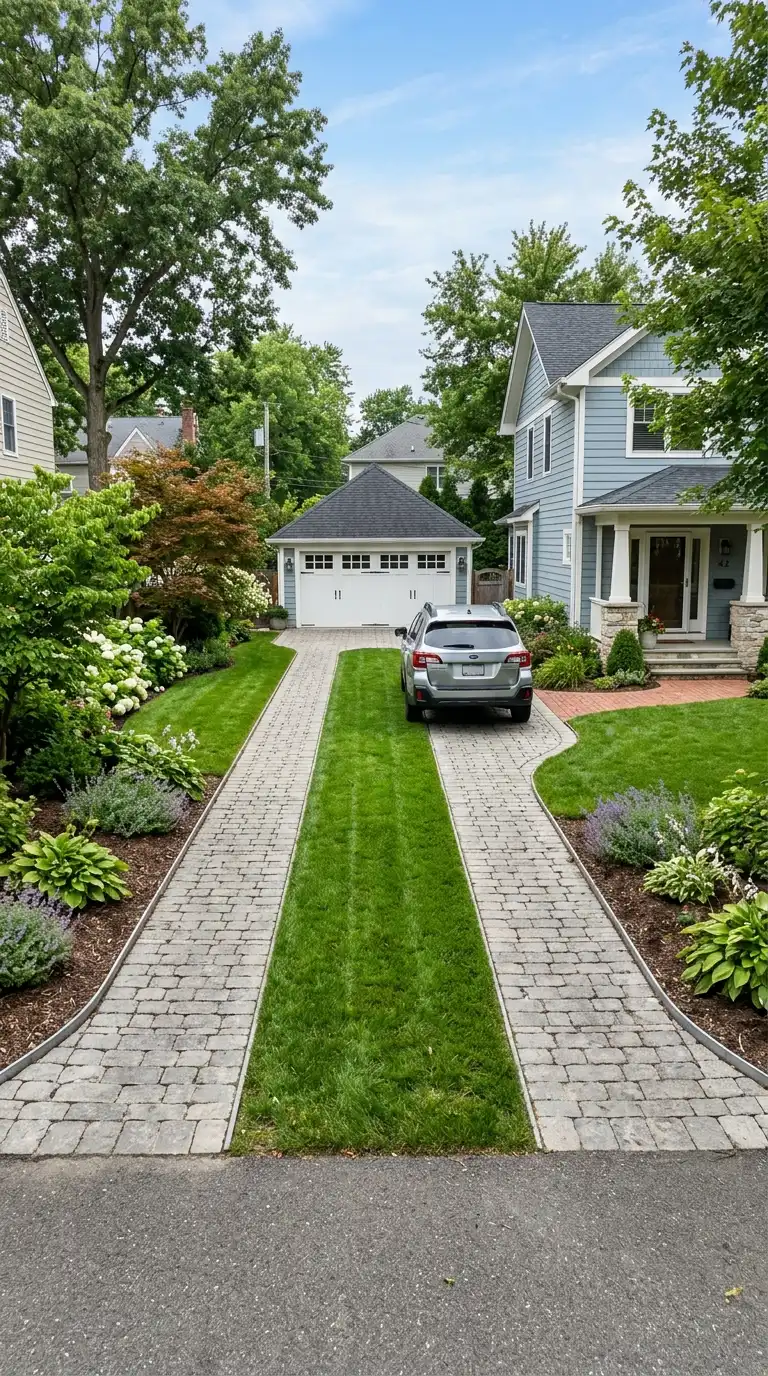 A paver driveway with turf strips combines durability with permeability. Lay pavers in two parallel tracks for the wheels, with turf growing in the center strip. This design reduces the amount of hardscape, allows water to infiltrate, and creates a beautiful, park-like entrance. Use large-format concrete or stone pavers for stability.