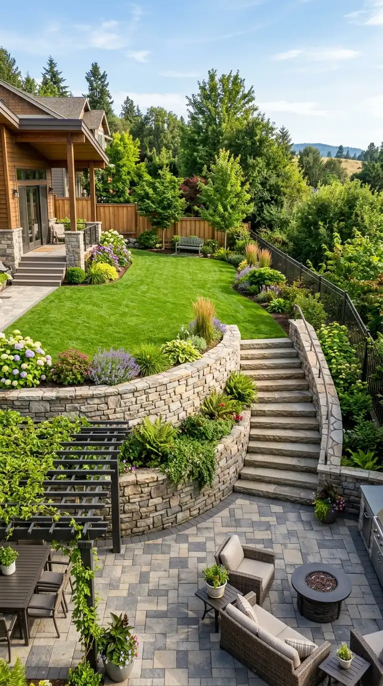 For sloped yards, create terraced levels with turf on the flat surfaces and paver retaining walls to hold the earth. The paver walls add structure and prevent erosion, while the turf provides a soft, usable surface. Use stone or concrete pavers for the walls, and plant trailing vines to soften the edges.
