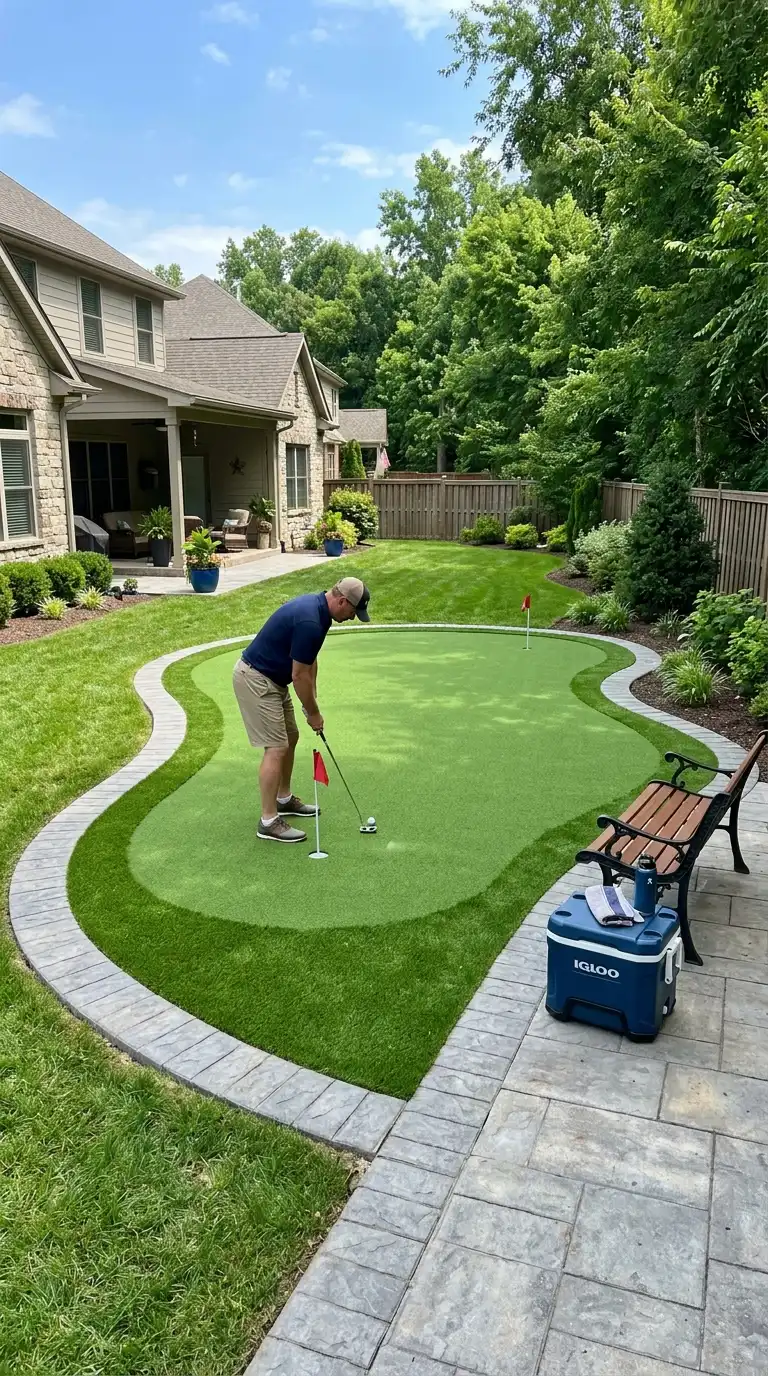 Create a backyard putting green with artificial turf and a paver surround. The turf provides a smooth, consistent surface for putting, and the pavers create a border and a stable area for standing. Add a paver pathway around the green and a small seating area nearby.