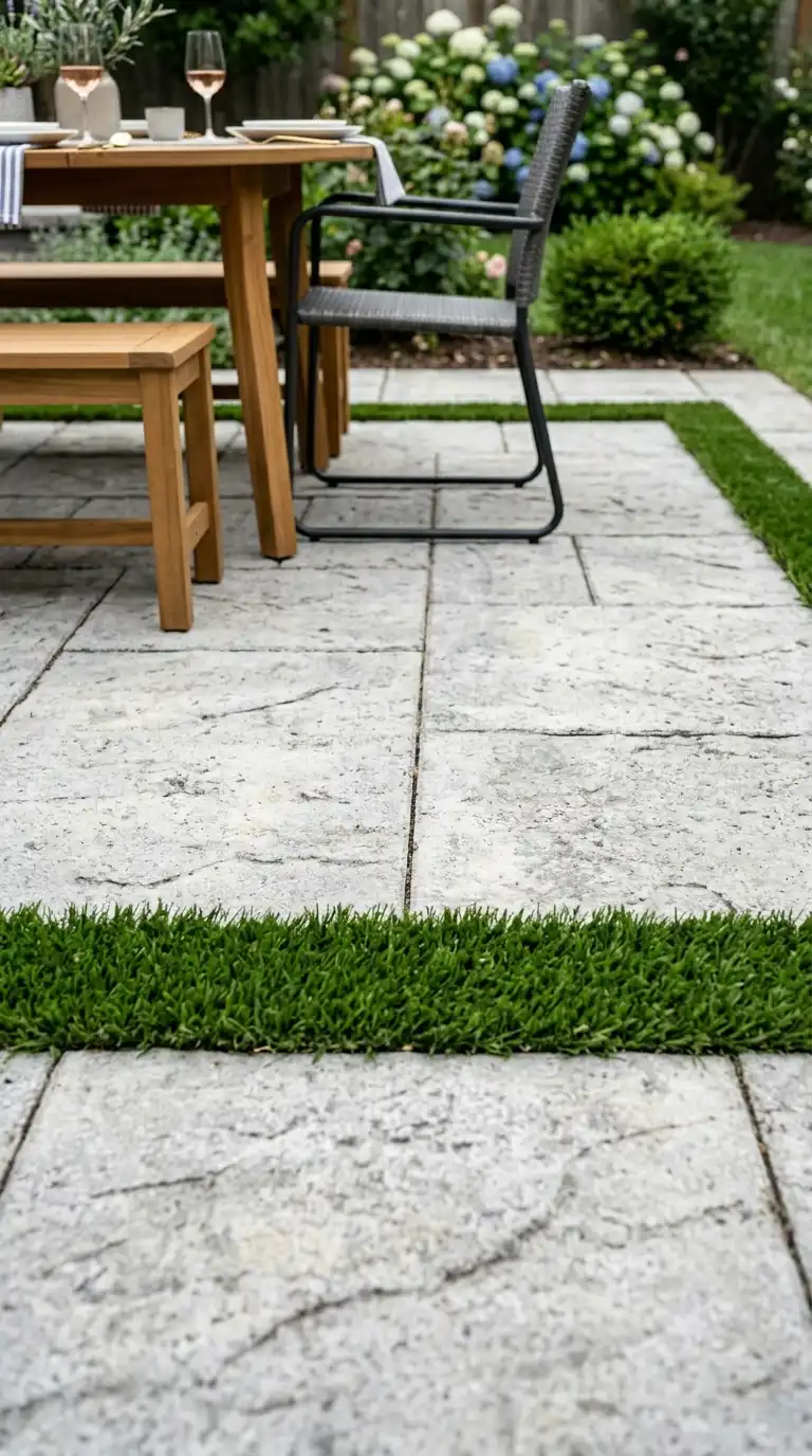 Create a patio with turf inlays for a soft, natural look. Lay pavers in a square or rectangular shape, but leave openings or strips where turf can grow. The turf softens the hardscape and adds color and texture. This design works well for dining or lounge areas where you want the stability of pavers but the comfort of grass underfoot.
