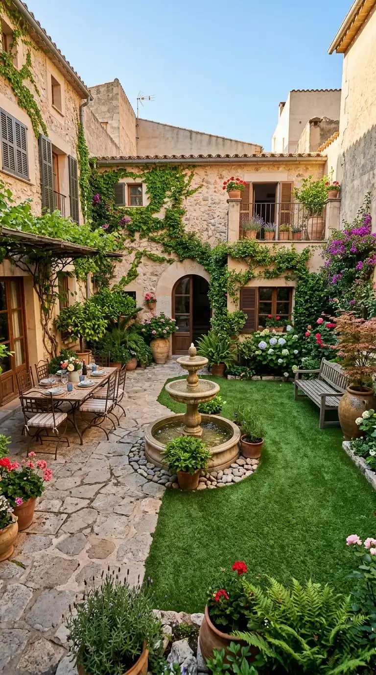 Create an enclosed courtyard with a mix of turf and pavers. Use pavers for the dining and lounging areas, and turf for a small lawn or garden. Add potted plants, a fountain, and comfortable furniture. The combination of soft and hard surfaces creates a balanced, inviting outdoor room.