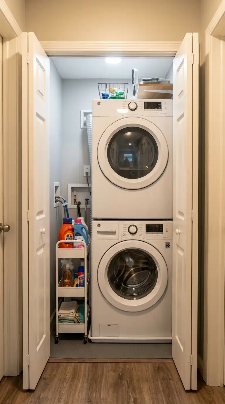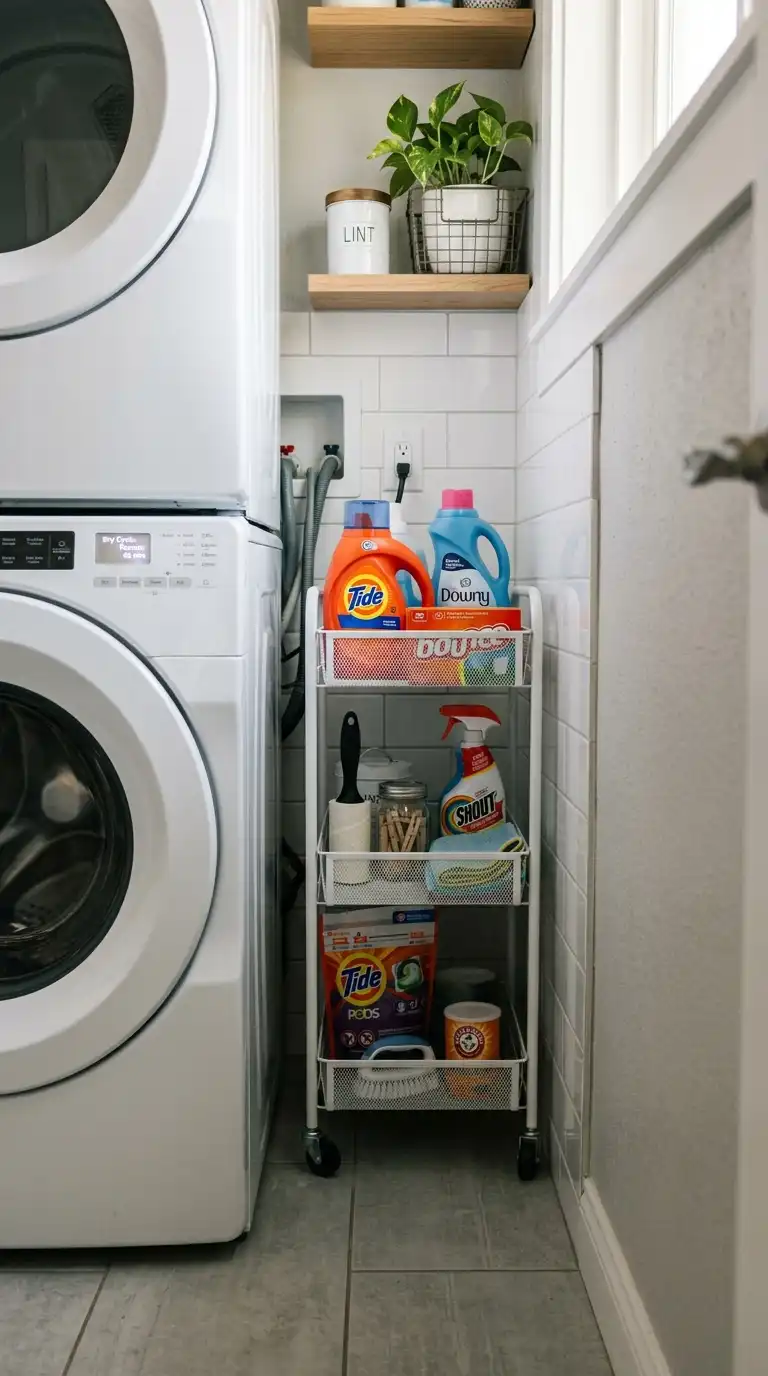 A narrow rolling cart can fit into the tightest spaces in a very small laundry room. Slide one between the washer and dryer, beside the stack, or under a folding counter. Use the cart to hold detergent, dryer sheets, stain removers, and other supplies. Choose a cart with locking wheels for stability and multiple tiers for extra storage.