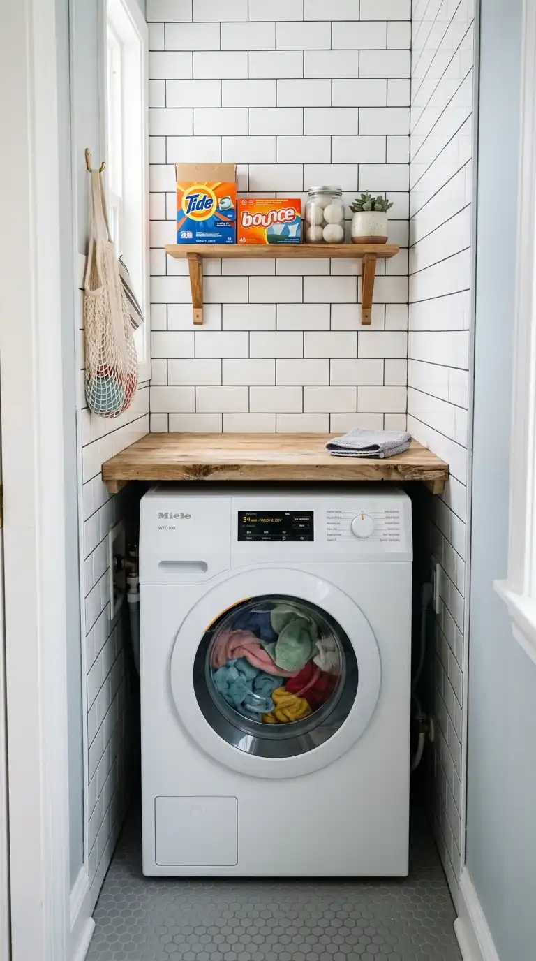 A countertop over your front-loading washer and dryer creates a much-needed folding station without taking up additional floor space. Use butcher block, laminate, or quartz for the surface. Ensure there is enough clearance to open the machine doors fully. Use the space above for wall cabinets or open shelving to keep supplies within easy reach.