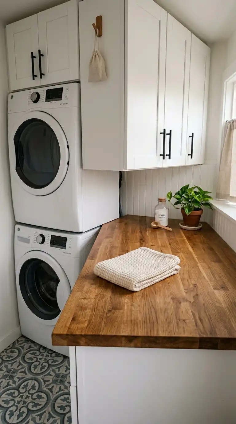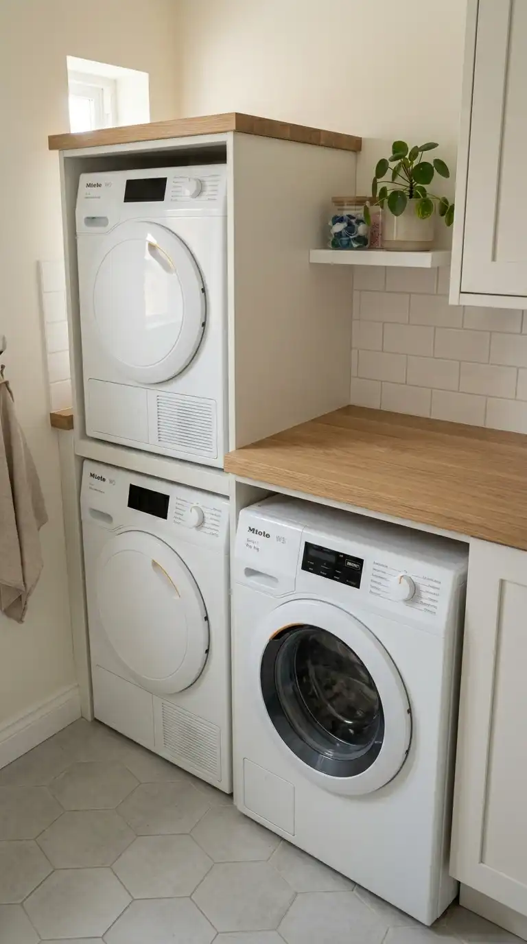 If you have a long, narrow countertop, install an under-counter washer and dryer. These compact units fit beneath a standard counter, leaving the countertop free for folding. Use the space above for wall cabinets. This design creates a seamless, built-in look and keeps the floor area clear.