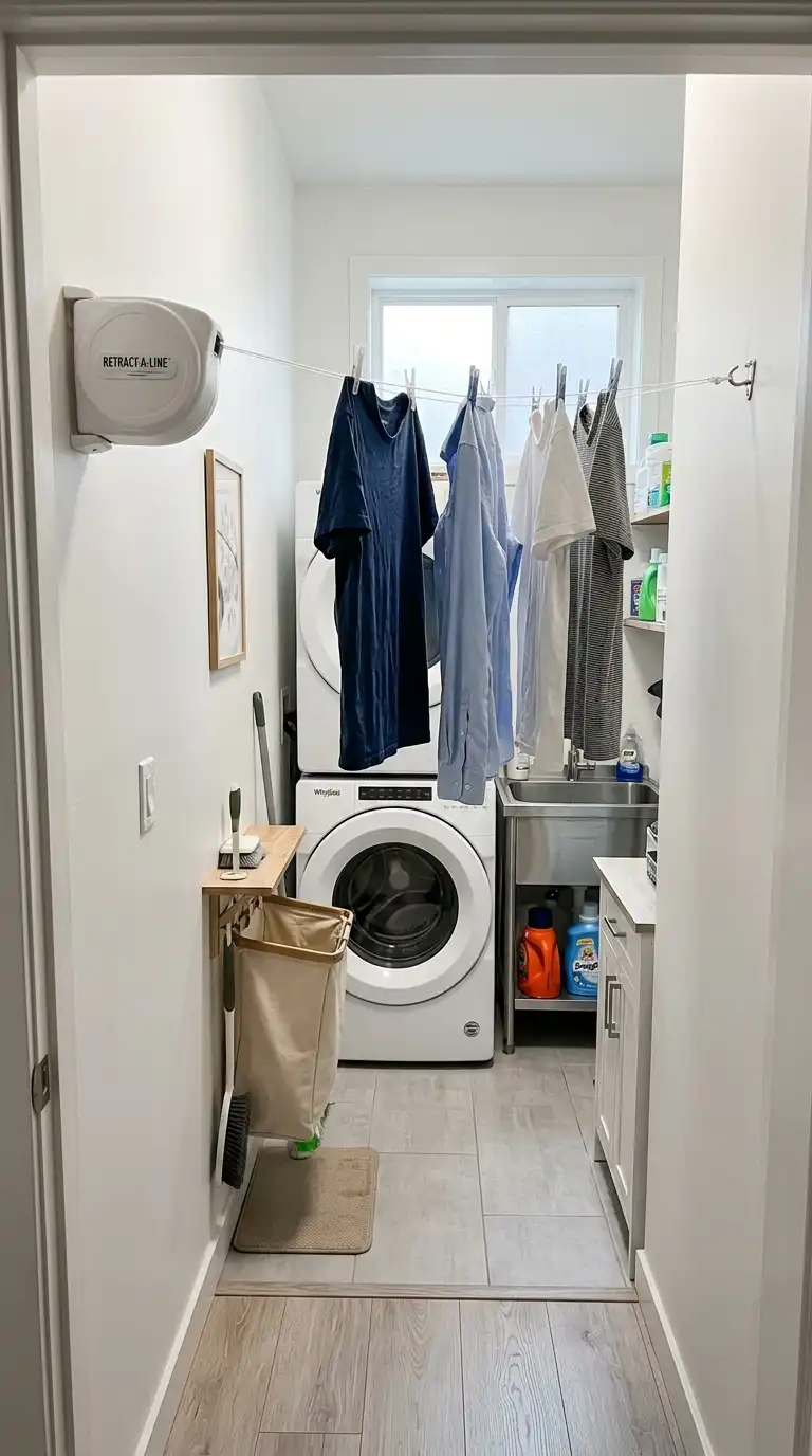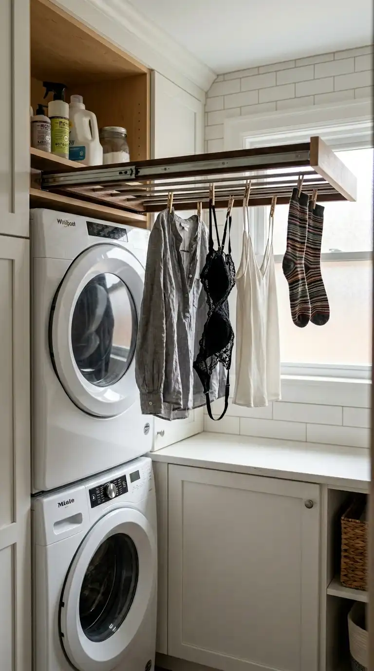 A pull-out drying rack is a space-saving solution for air-drying delicates. Install the rack above the washer and dryer or inside a tall, narrow cabinet. When not in use, it slides away completely. For even tighter spaces, consider a retractable clothesline mounted on the wall or an over-the-door drying rack that folds flat.