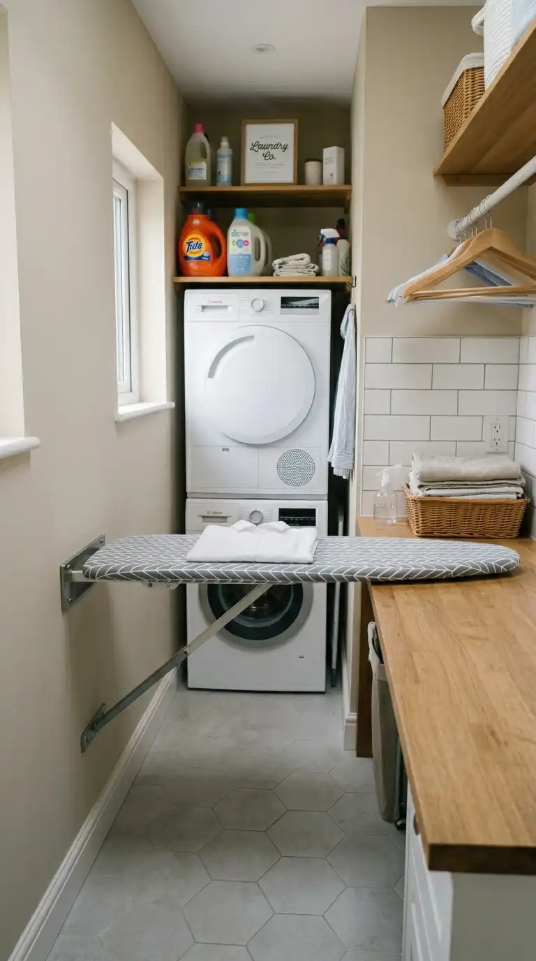 A wall-mounted, fold-down ironing board saves valuable floor space in a very small laundry room. Install it on the back of the door or on an empty wall. When not in use, it folds flat against the wall. Some models include a built-in shelf for the iron. This is especially useful in small rooms where a freestanding board would block the pathway.