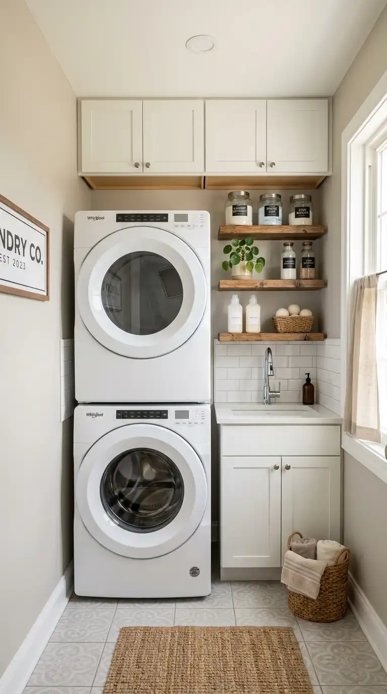 In a very small room, depth is at a premium. Use shallow cabinets (12-15 inches deep) instead of standard-depth cabinets. Install them on the wall above the washer and dryer or on the opposite wall. Open shelving is another good option, as it takes up less visual space than closed cabinets. Use matching baskets or glass jars to keep supplies organized.