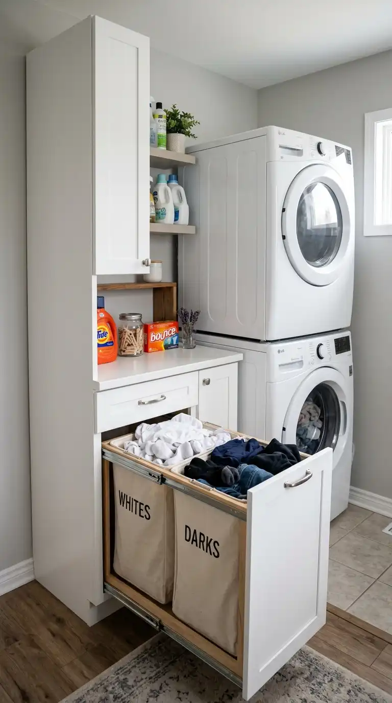 A pull-out hamper keeps dirty laundry concealed and saves floor space. Install a pull-out or tilt-out hamper inside a tall, narrow cabinet. Choose a hamper with two compartments for sorting lights and darks. Position the hamper directly beside or below the washer for easy loading. A narrow hamper can also fit between the washer and the wall.