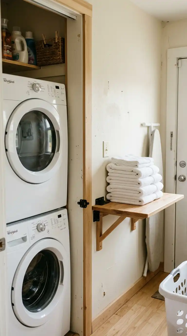 If you don’t have room for a full countertop, install a small fold-down shelf on the wall. The shelf folds flat when not in use and provides a temporary folding surface when needed. Use it for folding a few items at a time or as a place to set a laundry basket. This is an excellent solution for very small rooms.