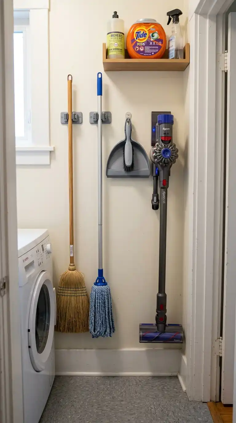 Keep cleaning tools off the floor by mounting them on the wall. Use wall-mounted brackets to hold a broom, mop, dustpan, and even a small vacuum. Install them on an empty wall or on the back of the door. This keeps the floor clear and makes the small space feel less cluttered.