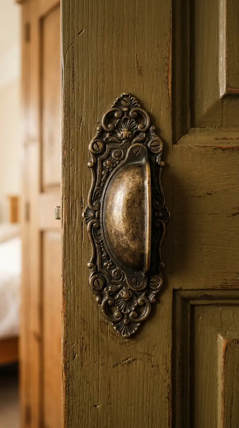 Swap modern handles for antique brass hardware to instantly add vintage character. Look for cup pulls, backplates with ornate detailing, or crystal knobs. The aged finish of antique brass adds warmth and a sense of history.
