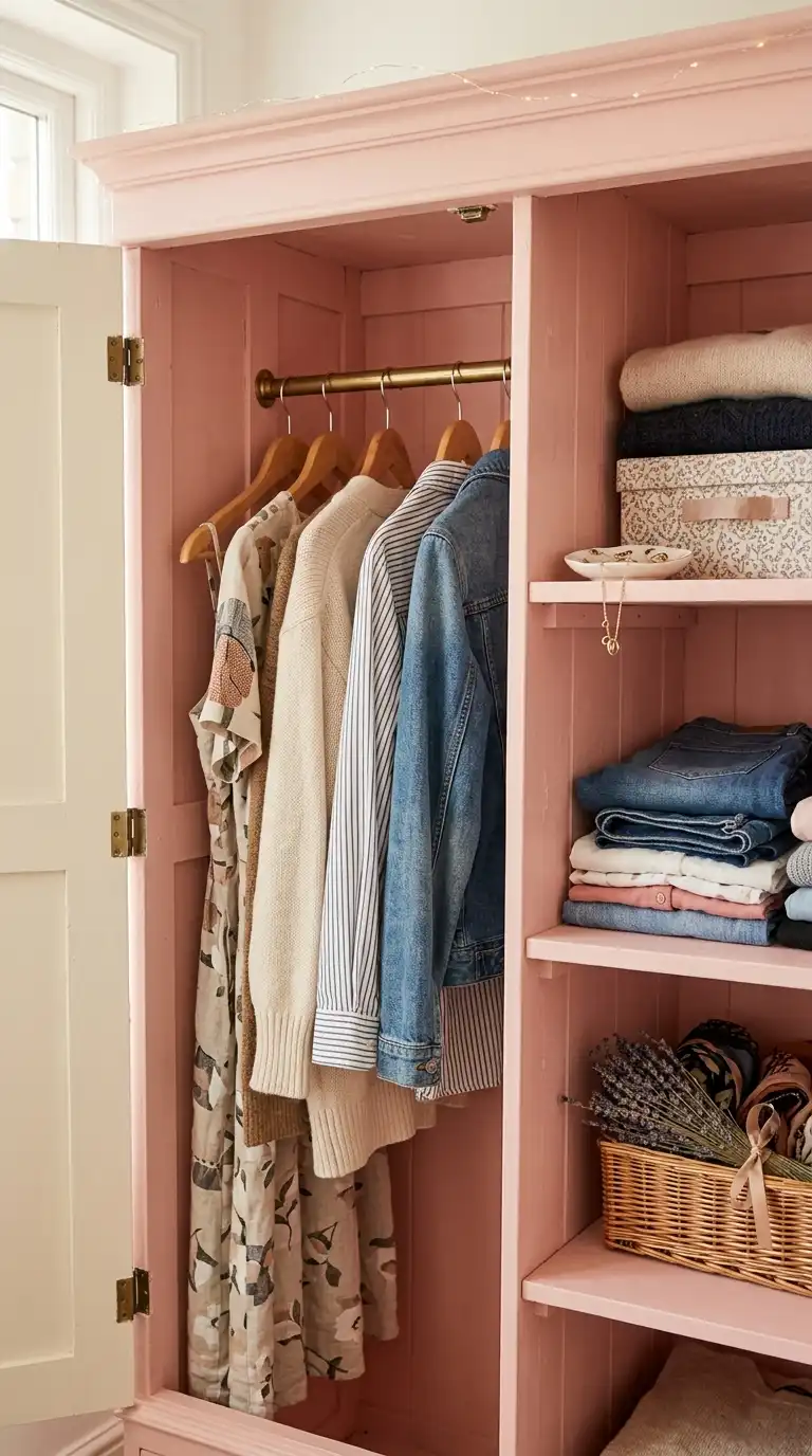 Surprise and delight with a painted interior in a vintage-inspired color. Soft pink, pale blue, or sage green inside the wardrobe adds a charming detail that contrasts with the exterior finish. The painted interior also makes it easier to see items.