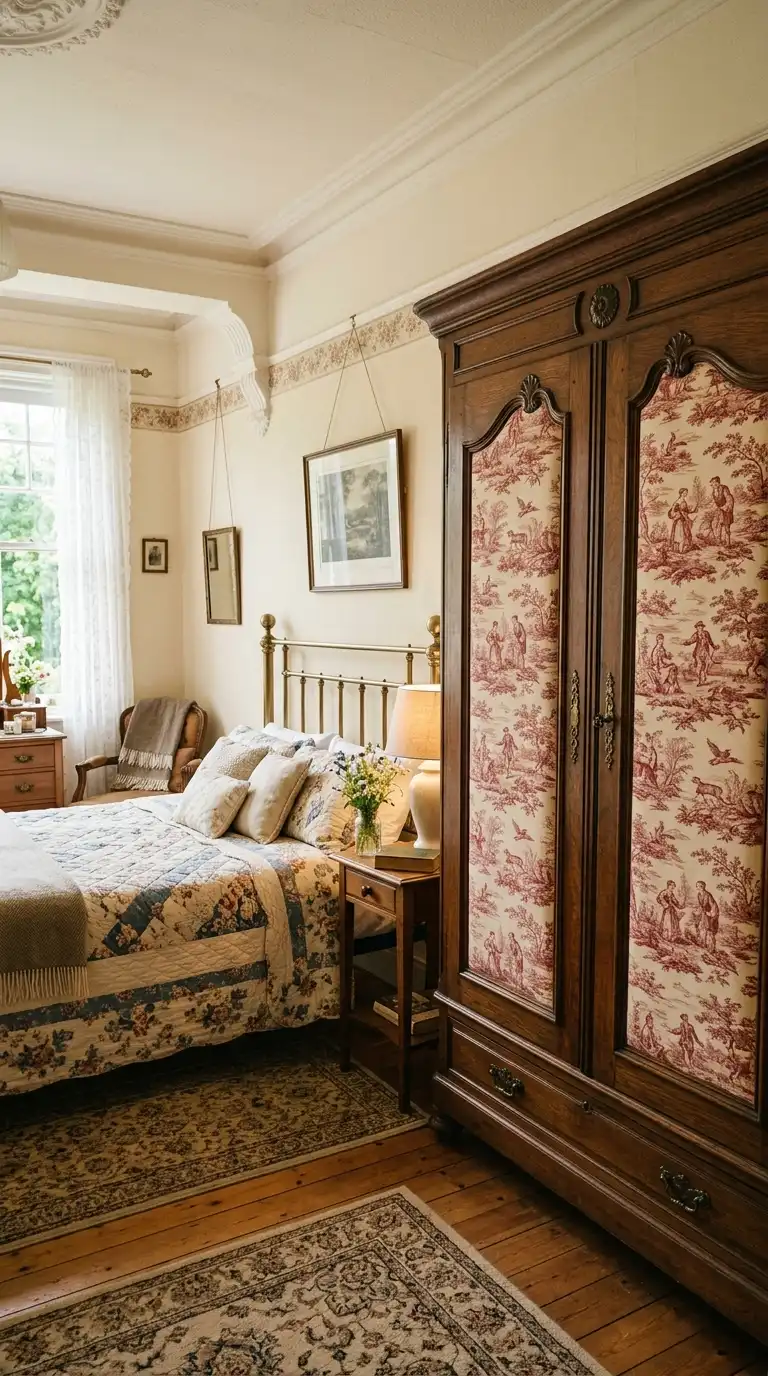 Inset vintage-inspired wallpaper or fabric panels into wardrobe doors for a soft, decorative touch. Choose patterns like toile, chintz, or botanical prints in muted colors. The fabric or paper adds color, pattern, and a sense of warmth.