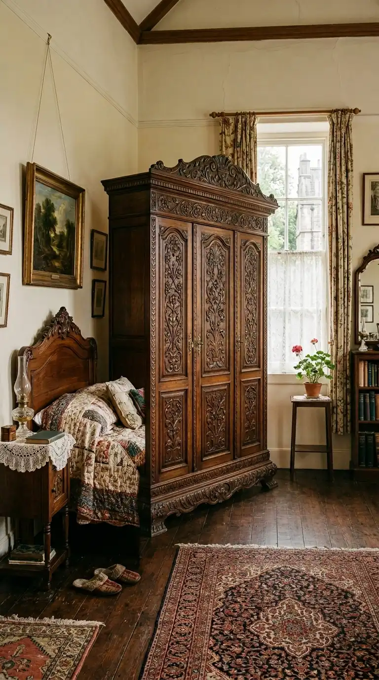 Incorporate ornate carved details into your wardrobe for a truly antique feel. Look for pieces with carved floral motifs, scrollwork, or architectural elements like fluted columns or pediments. These details add craftsmanship and visual interest, making the wardrobe a statement piece.