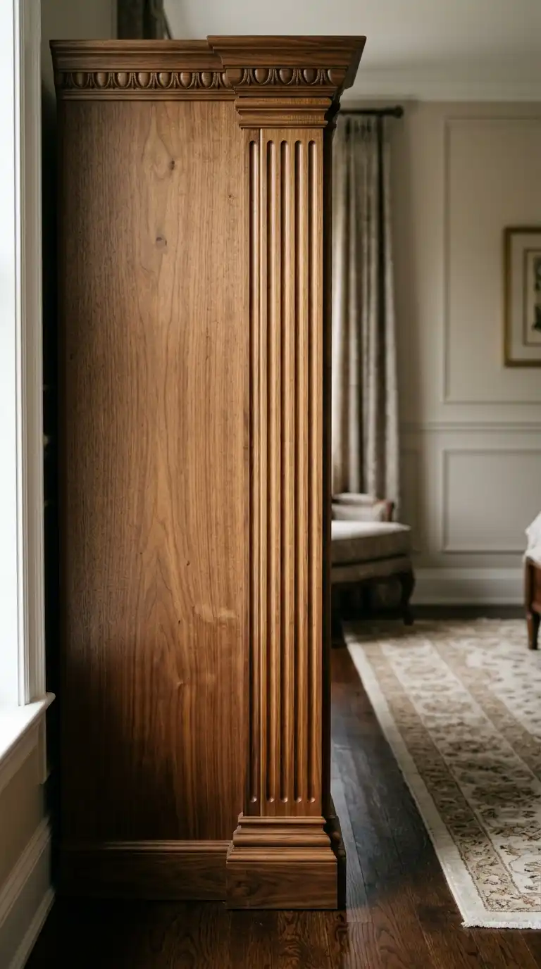 Fluted or reeded columns on the sides or front of a wardrobe add classical architectural detail. The vertical grooves create rhythm and texture, adding elegance without overwhelming the design. This detail is common in Georgian and Regency-era furniture.