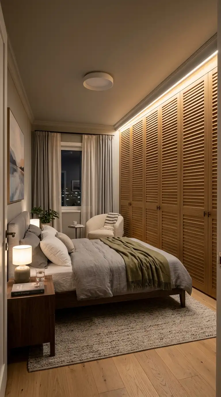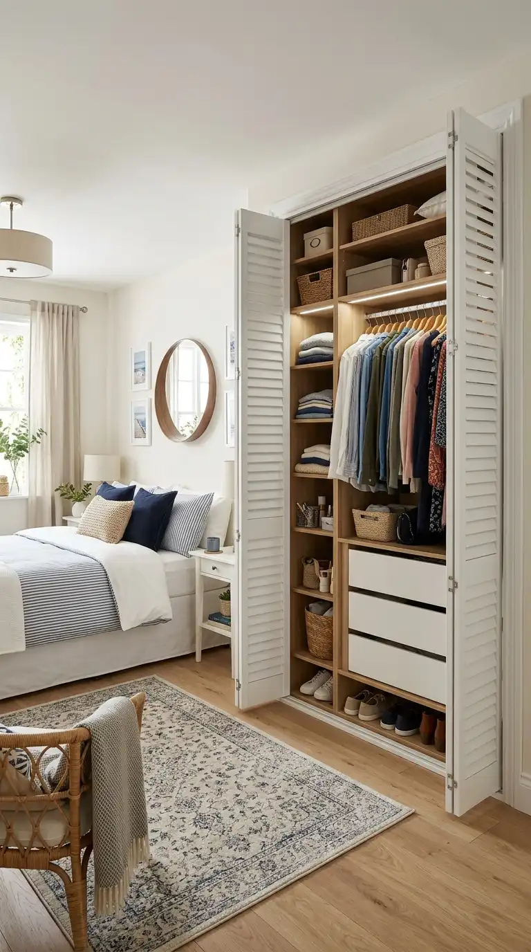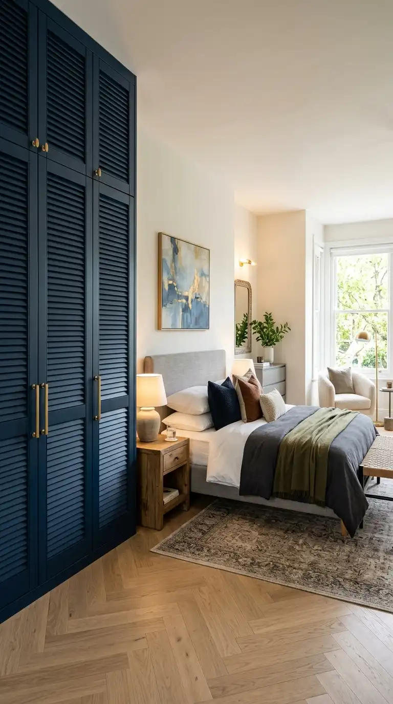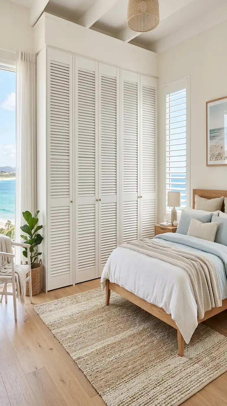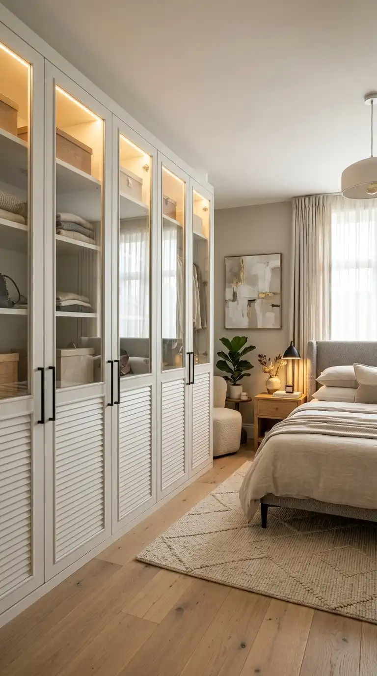 Combine louvered sections with glass panels for a wardrobe that balances texture with transparency. Use glass in the upper sections to display accessories or folded items, while shutters below provide ventilation and privacy. This design adds lightness and elegance to the overall composition.