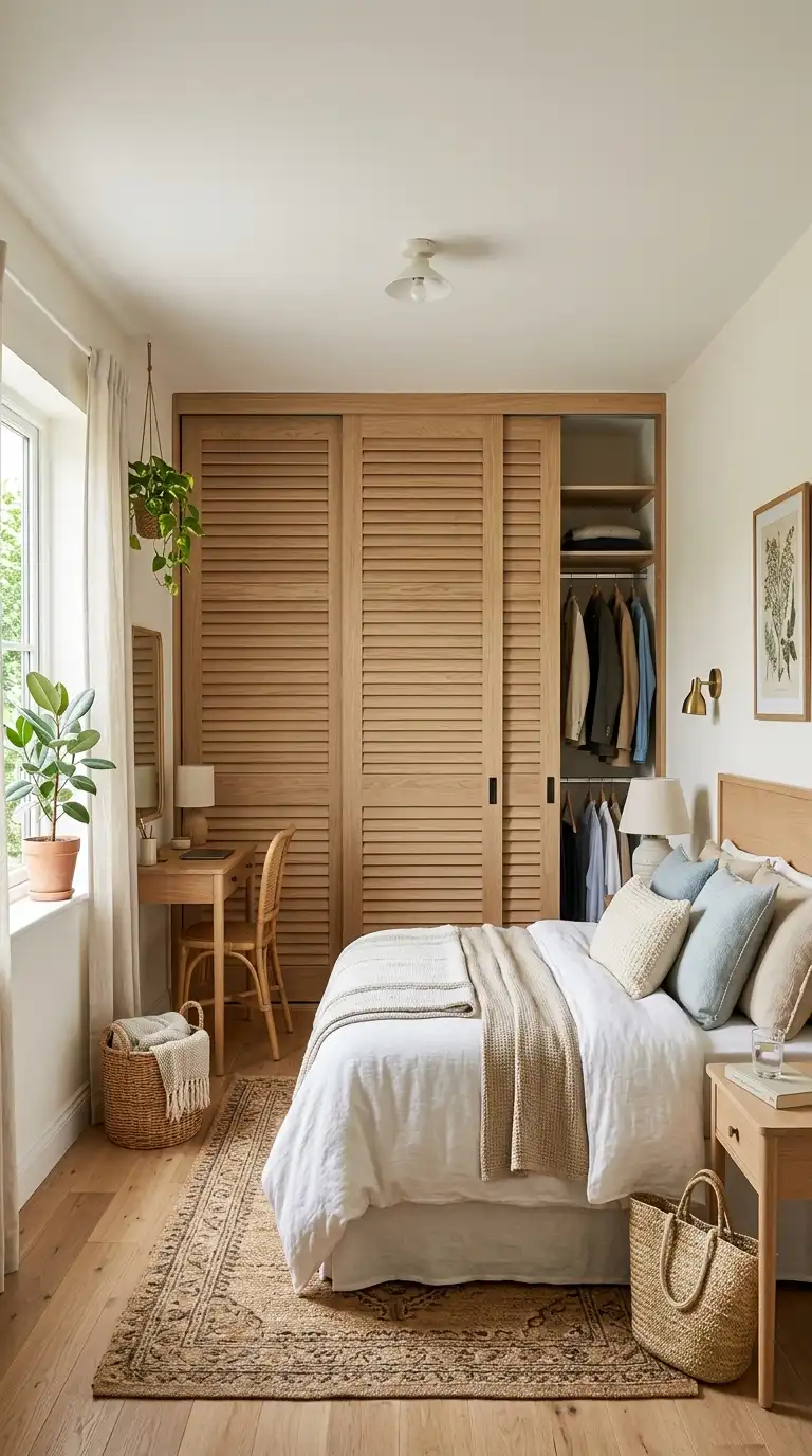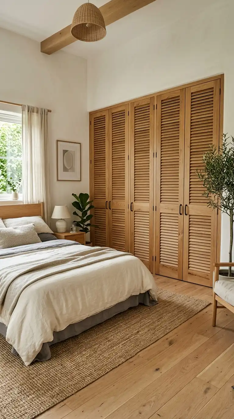 Natural wood shutter doors bring warmth, texture, and organic beauty to a bedroom. Choose wood species like oak, teak, or cedar, finished with a clear sealant to highlight the grain. The natural tones complement coastal, Scandinavian, and rustic interiors, adding a sense of calm and connection to nature.