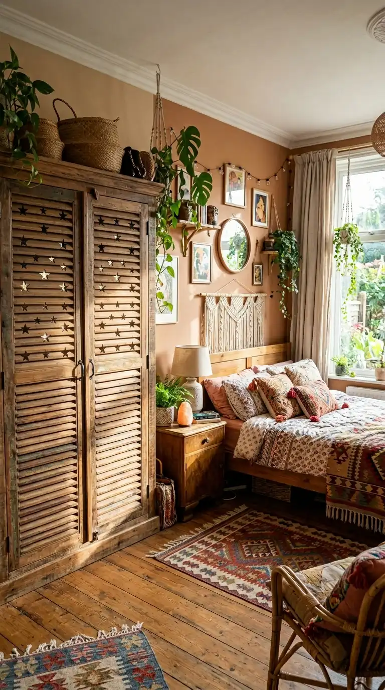 Incorporate decorative cutouts into your shutter doors for added visual interest. Patterns like stars, circles, or geometric shapes can be cut into the solid sections of the door, creating a play of light and shadow. This design works beautifully in bohemian, eclectic, and children’s bedrooms where whimsy is welcome.