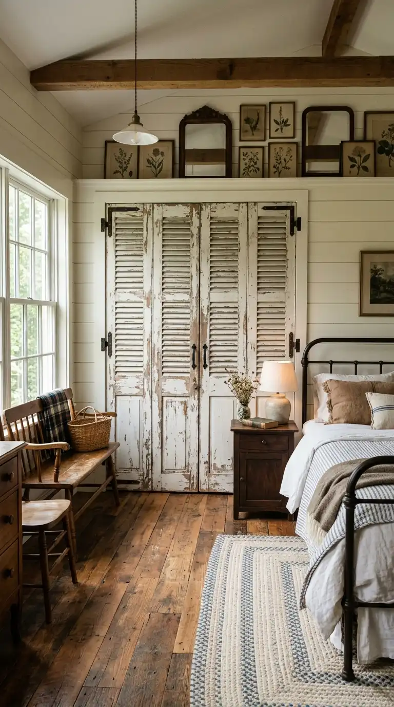 Distressed or weathered shutter doors add vintage charm and a sense of history to a bedroom. The worn finish—achieved through paint techniques or reclaimed wood—adds character and texture. This style works beautifully in farmhouse, cottage, and eclectic interiors, where authenticity and patina are celebrated.