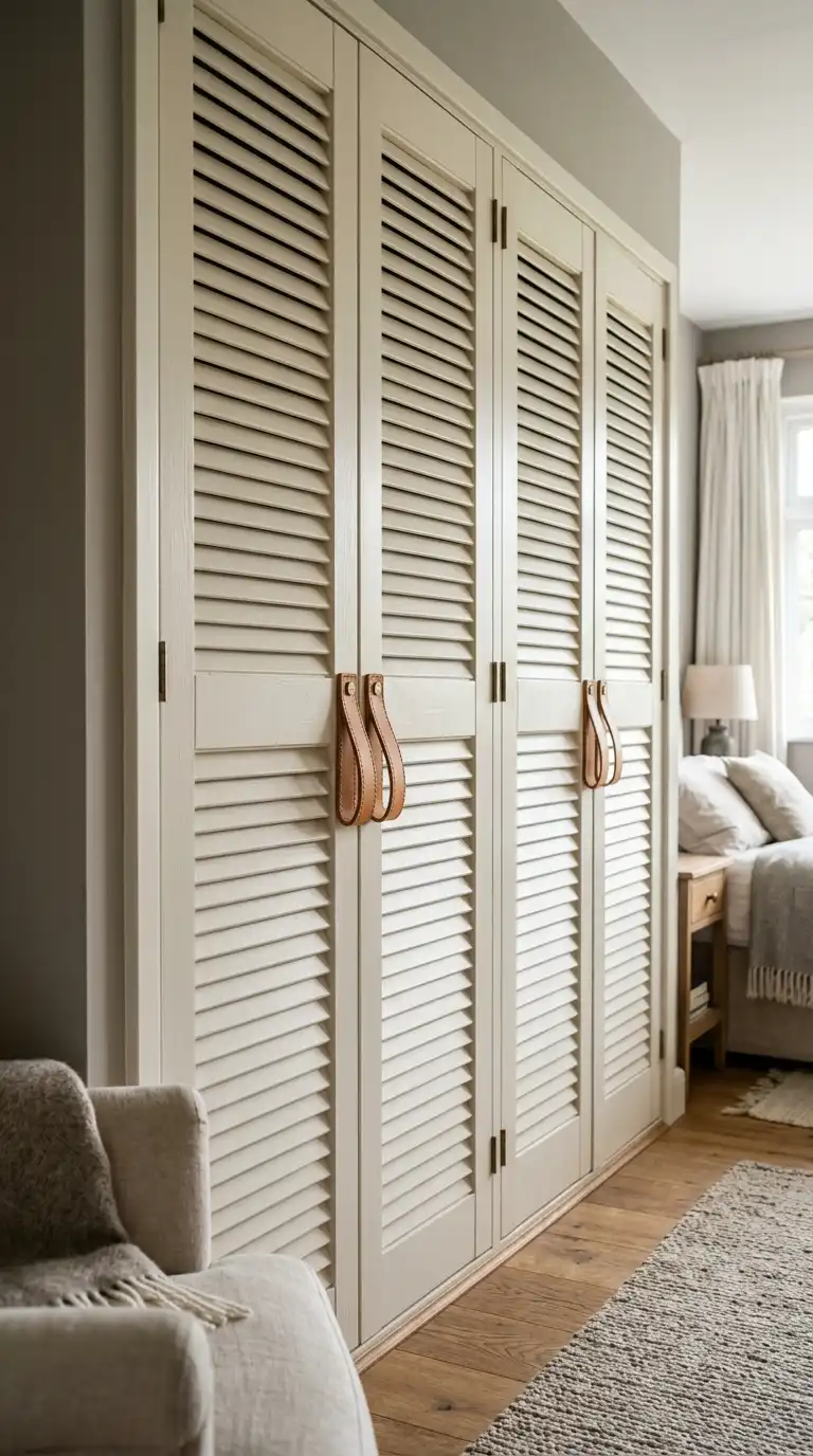 Swap traditional hardware for leather pulls to add a modern, organic touch to your shutter doors. Leather straps or loops in natural, black, or tan tones complement the texture of the louvers and add a handcrafted element. This detail is perfect for Scandinavian, bohemian, and contemporary interiors.